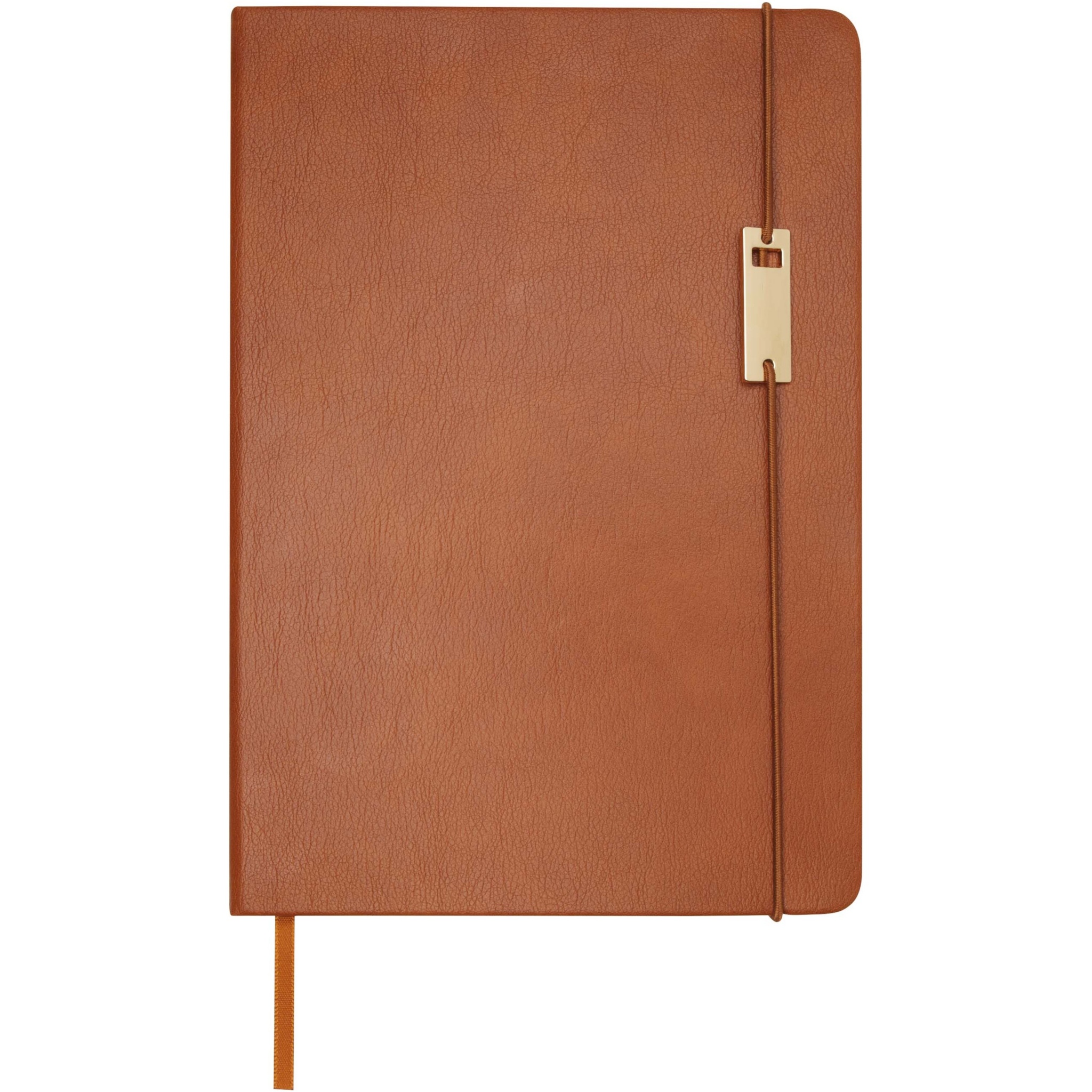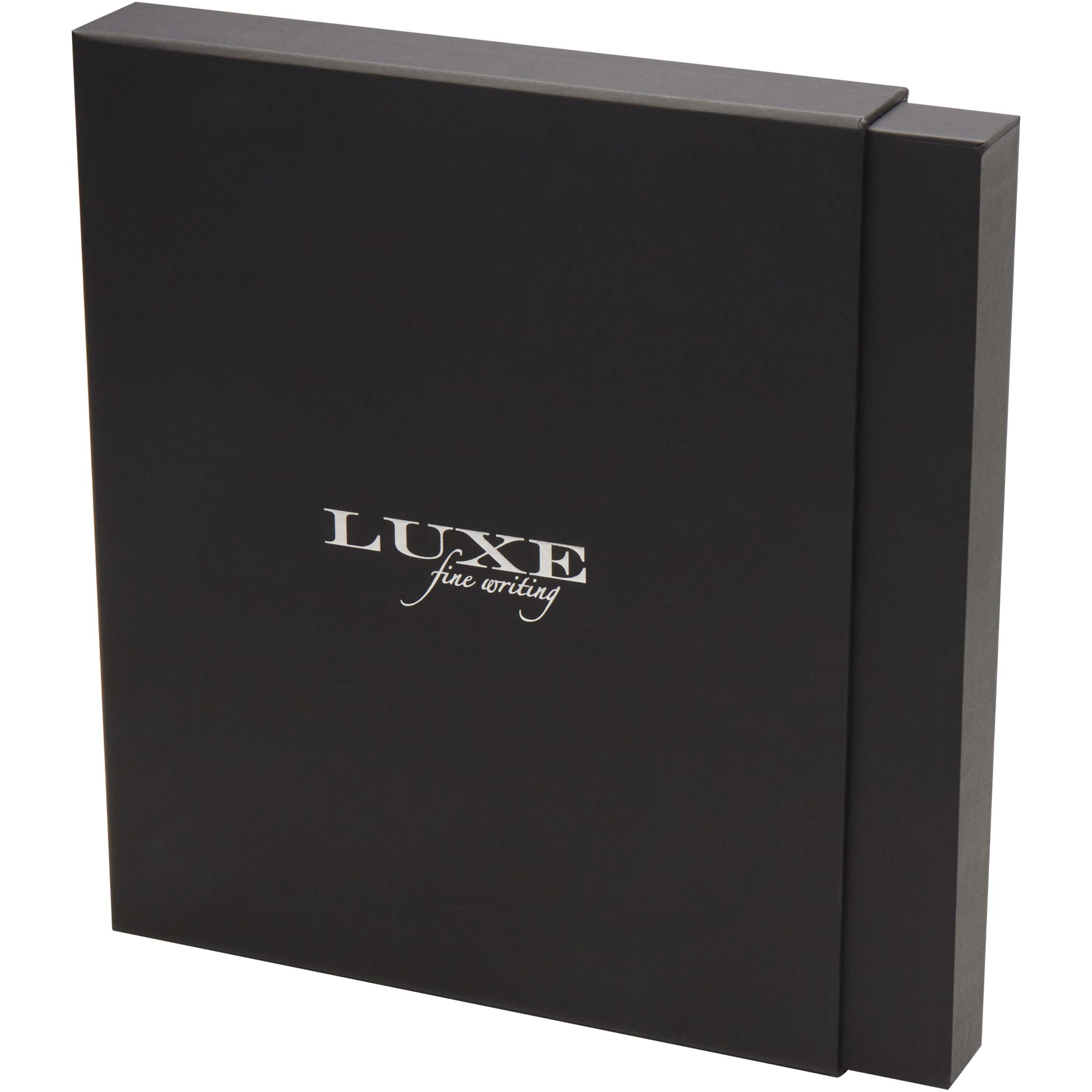 Legato — это элегантное сочетание блокнота формата А5 и ручки-роллера. Ручка имеет верхний корпус из переработанной латуни с золотым хромированием, нижний корпус с черно-коричневым напылением, металлические хромированные аксессуары из золота и логотип LUXE на среднем кольце. Цвет чернил: черный. Длина непрерывной линии: 400 метров. Размер пера: 0,7 мм. В блокноте 80 листов разлинованной бумаги плотностью 80 г/м², обложка из переработанного пластика, эластичная застежка, закладка-лента и карман-гармошка. Металлический аксессуар из хромированного золота на эластичной застежке. Поставляется в подарочной коробке из переработанного картона.