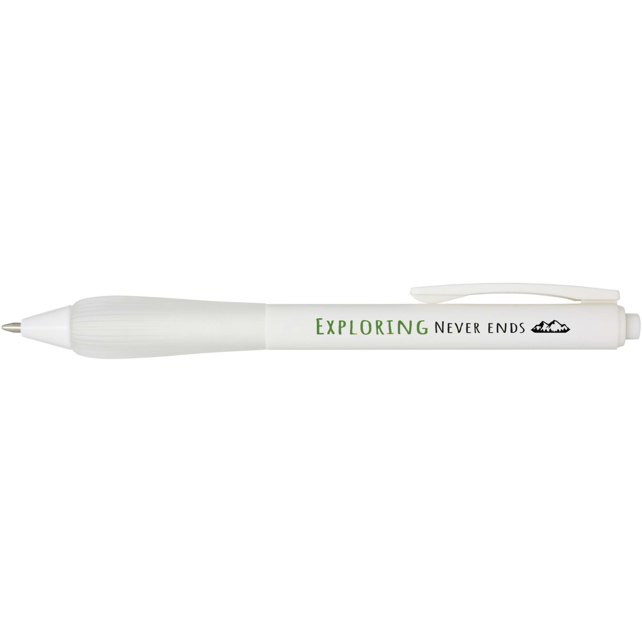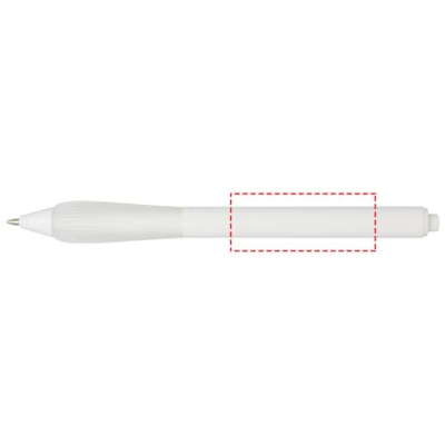 Шариковая ручка из переработанного пластика с прорезиненным корпусом и рукояткой из TPR. Цвет чернил: синий. Длина непрерывной линии: 1000 метров. Размер пера: 1,0 мм.