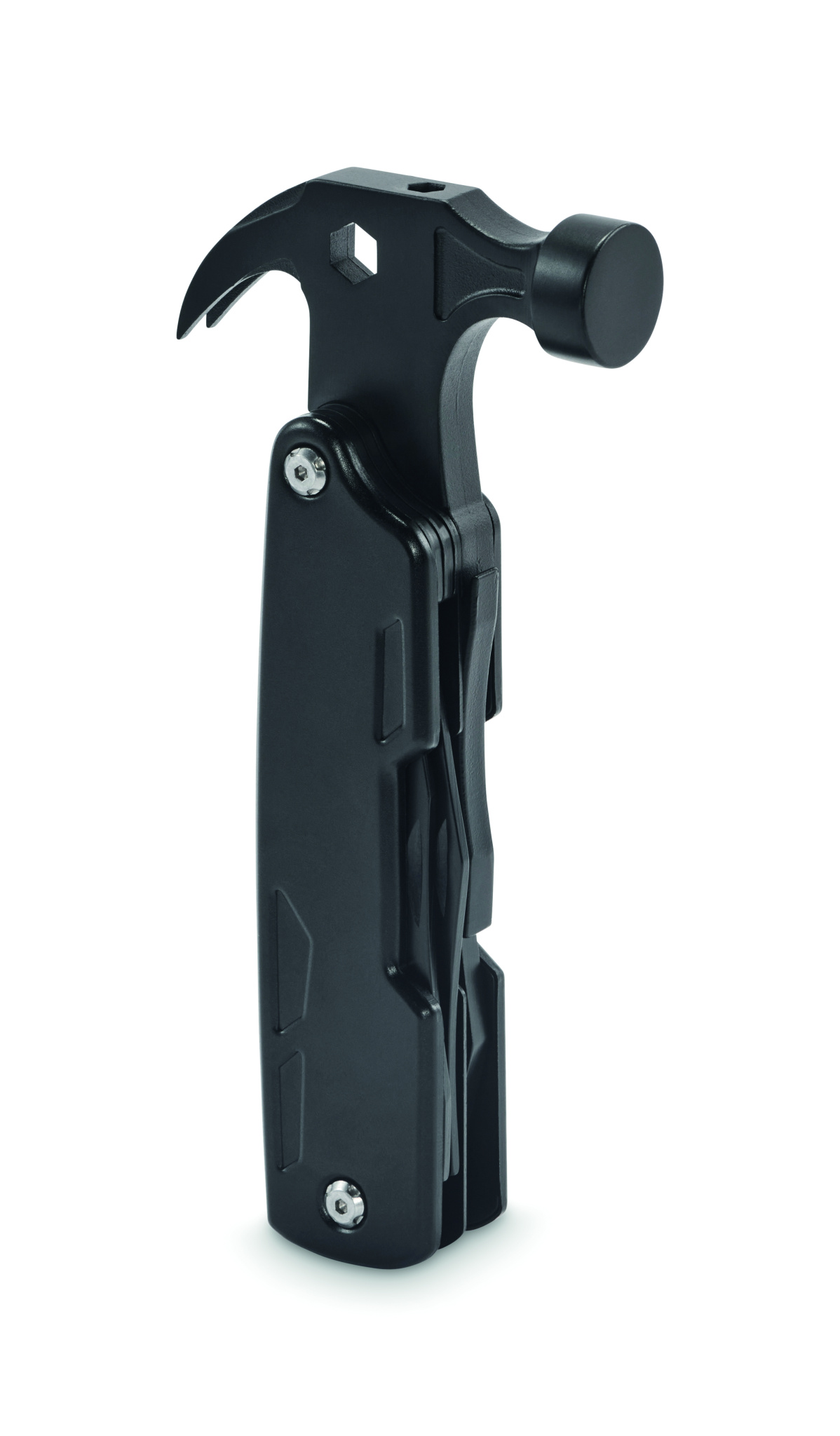 14-in-1 stainless steel multi tool hammer. With nail puller, hex wrench, serrated knife, steel file, variety of screwdrivers, regular pliers, needle-nose pliers, bottle opener, knife, wire cutter.