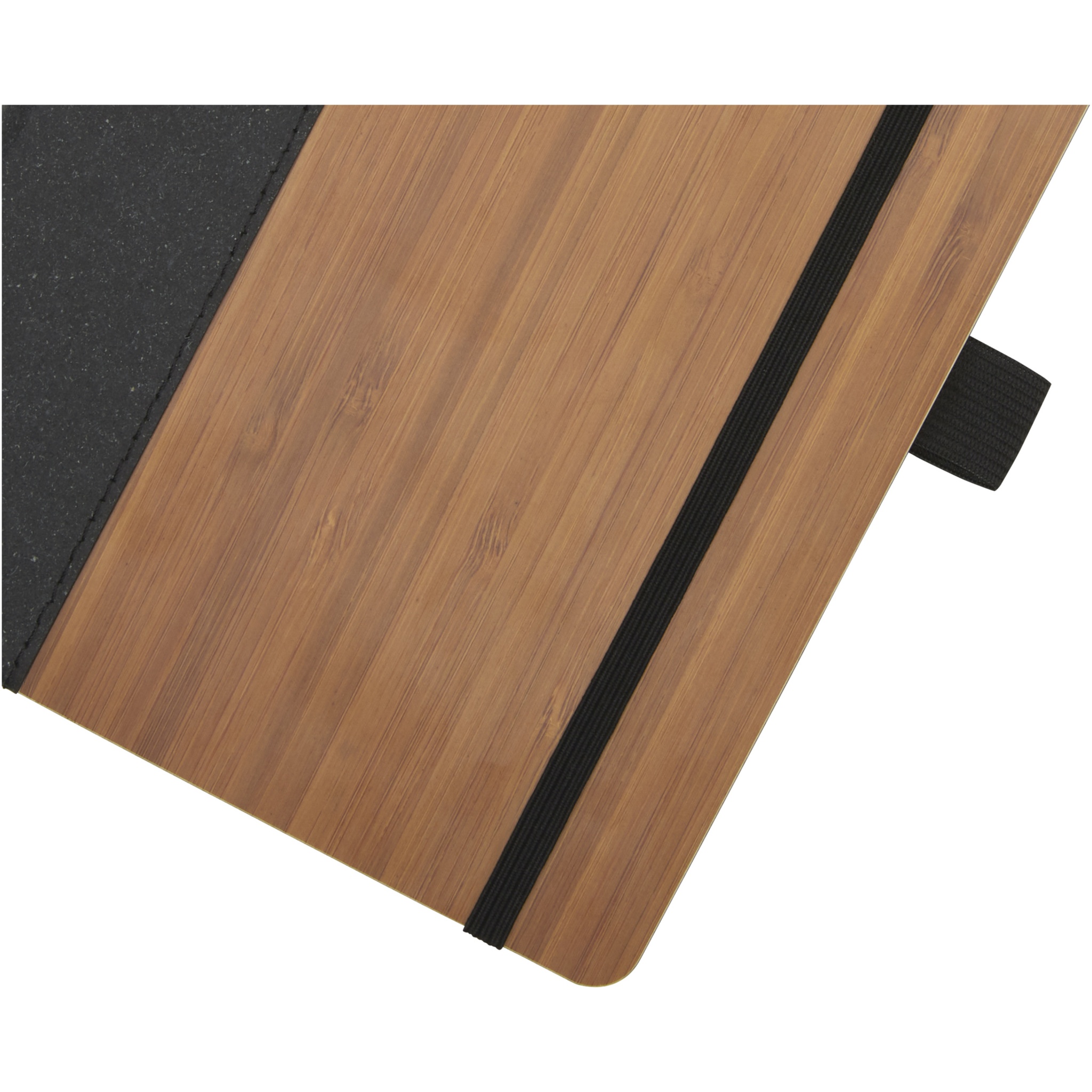 Блокнот формата А5 с бамбуковой обложкой и корешком из регенерированной кожи. 80 листов, линованная переработанная бумага плотностью 80 г/м2, черная петля для ручки, эластичная резинка и ленточка-закладка.