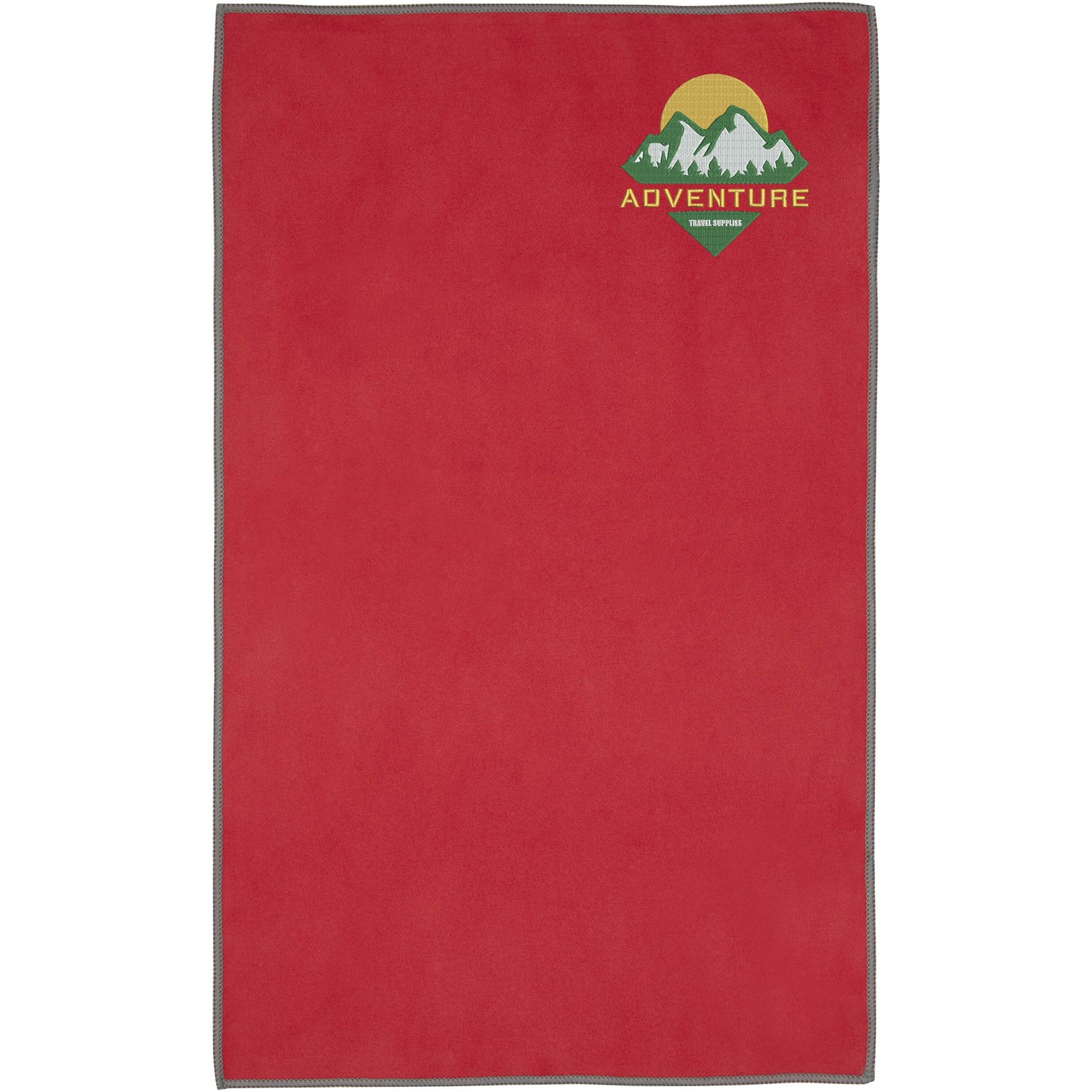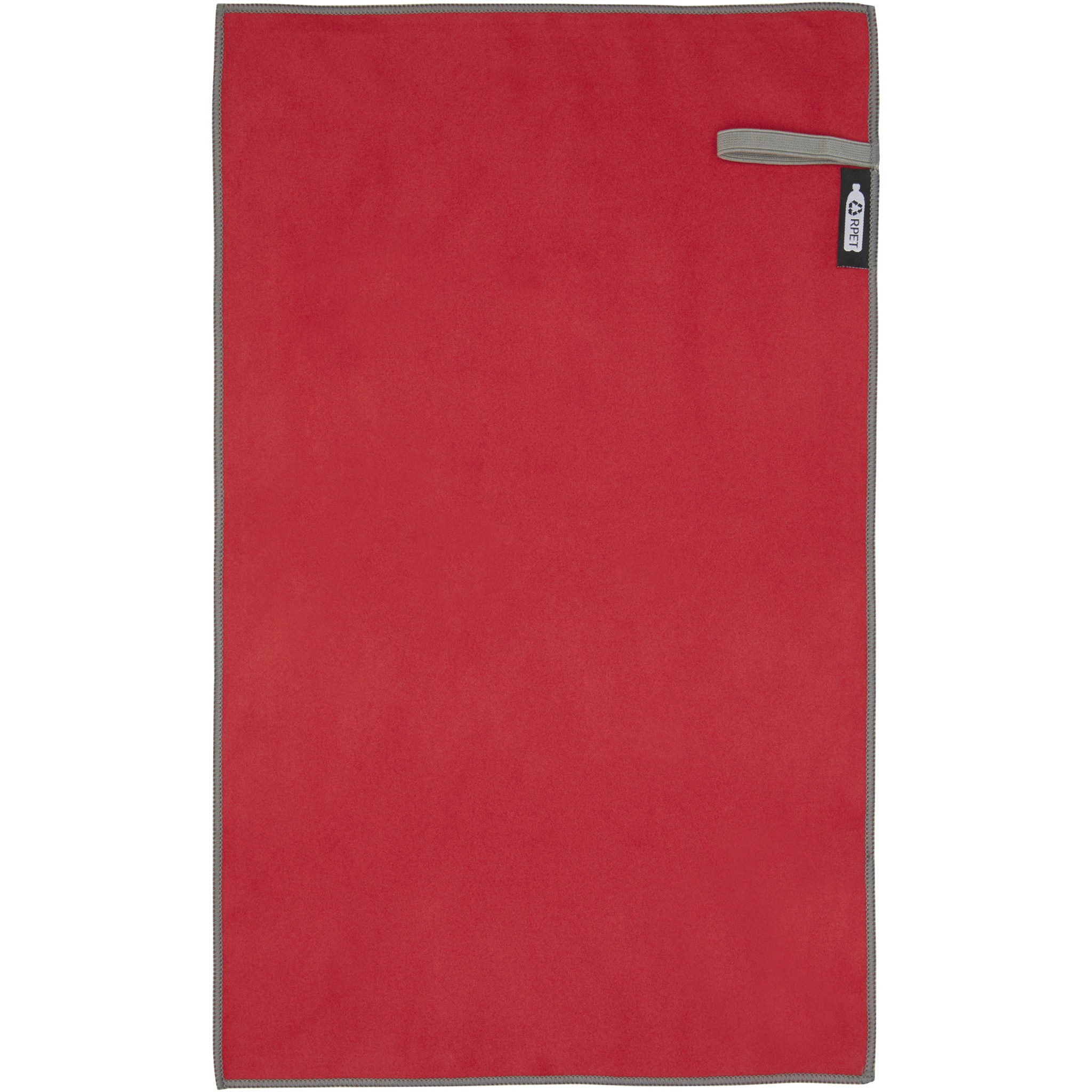 Спортивное полотенце Pieter очень хорошо впитывает влагу, легкое, быстро сохнет, а ткань прочная и очень мягкая. Когда полотенце сложено и закреплено резинкой, оно уменьшается до небольшого размера, поэтому его удобно брать с собой в тренажерный зал, бассейн, на пешую прогулку или в поход. Полотенце размером 50 х 30 см изготовлено из 90 % переработанного полиэстера GRS и 10 % нейлона. Его можно стирать в стиральной машине при температуре 40 °C. В комплект поставки входит мешок для хранения (15,5 x 10 см), изготовленный из переработанного ПЭТ-пластика, обеспечивающий большую площадь для печати логотипа.