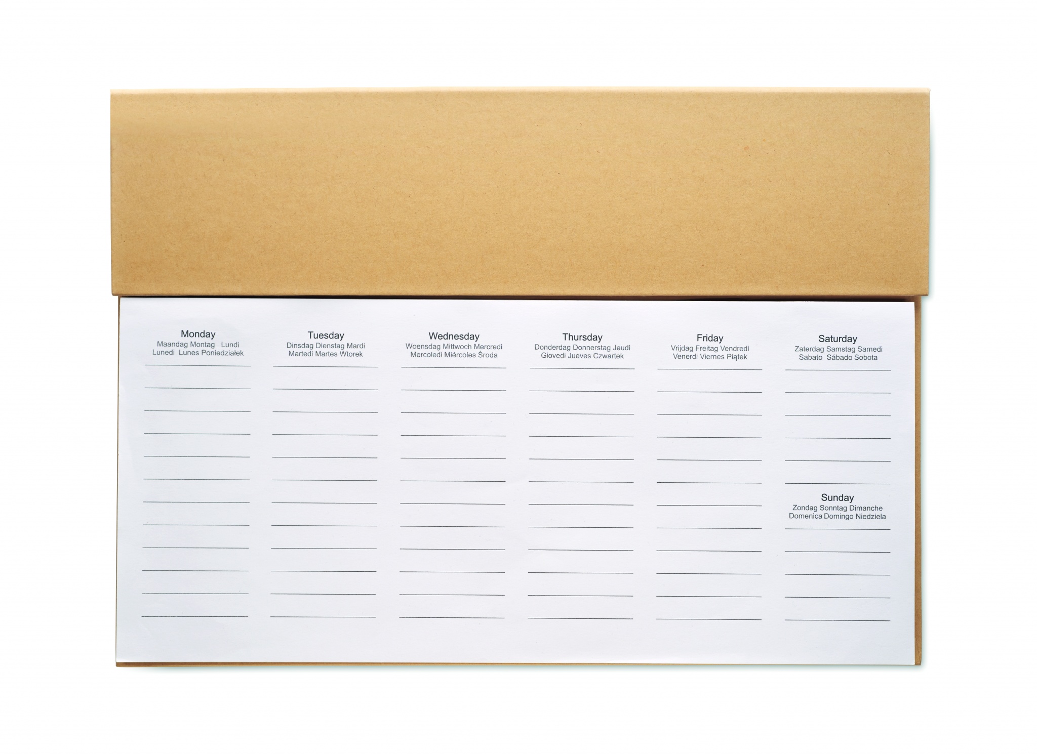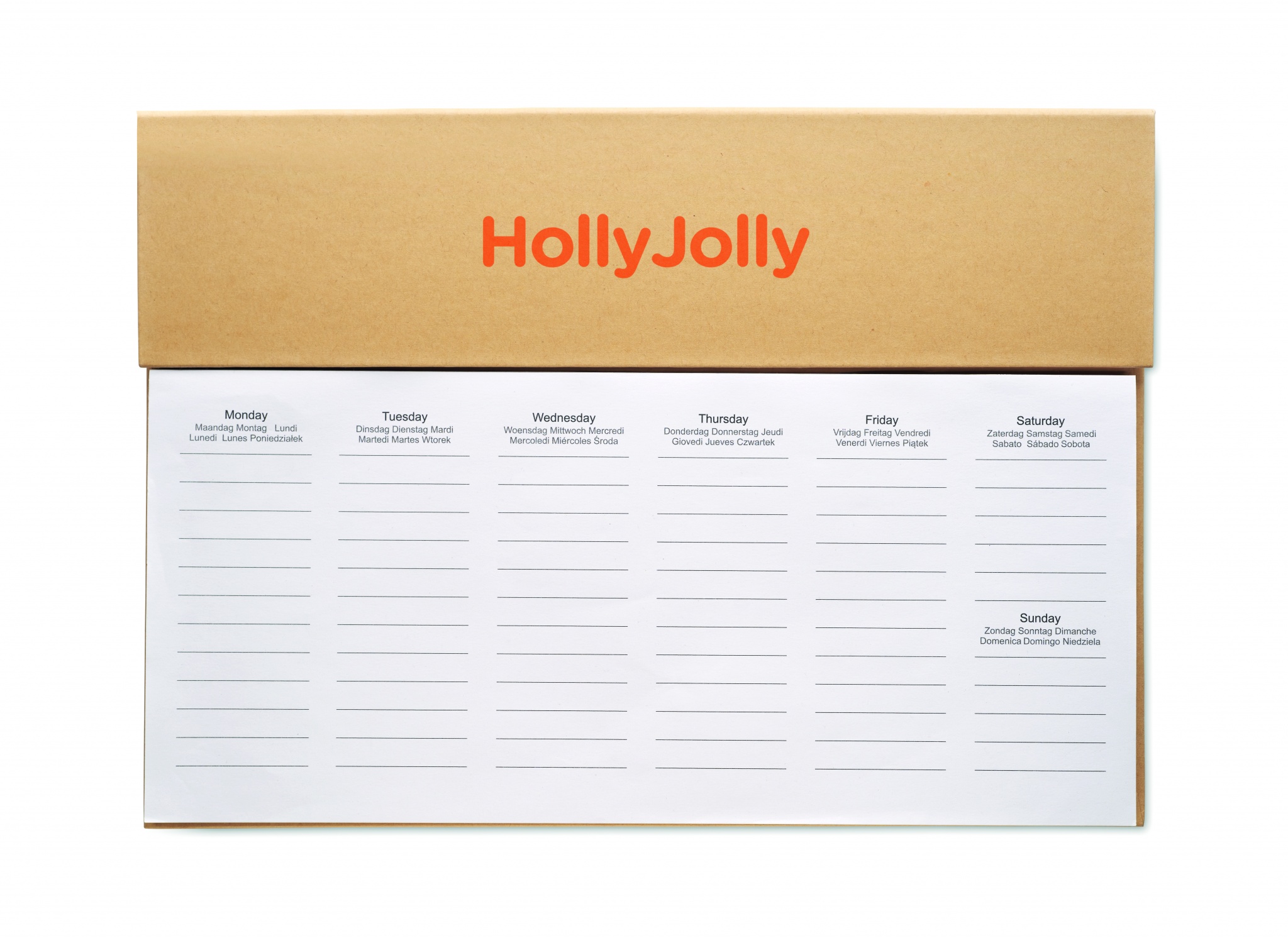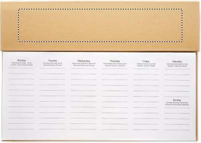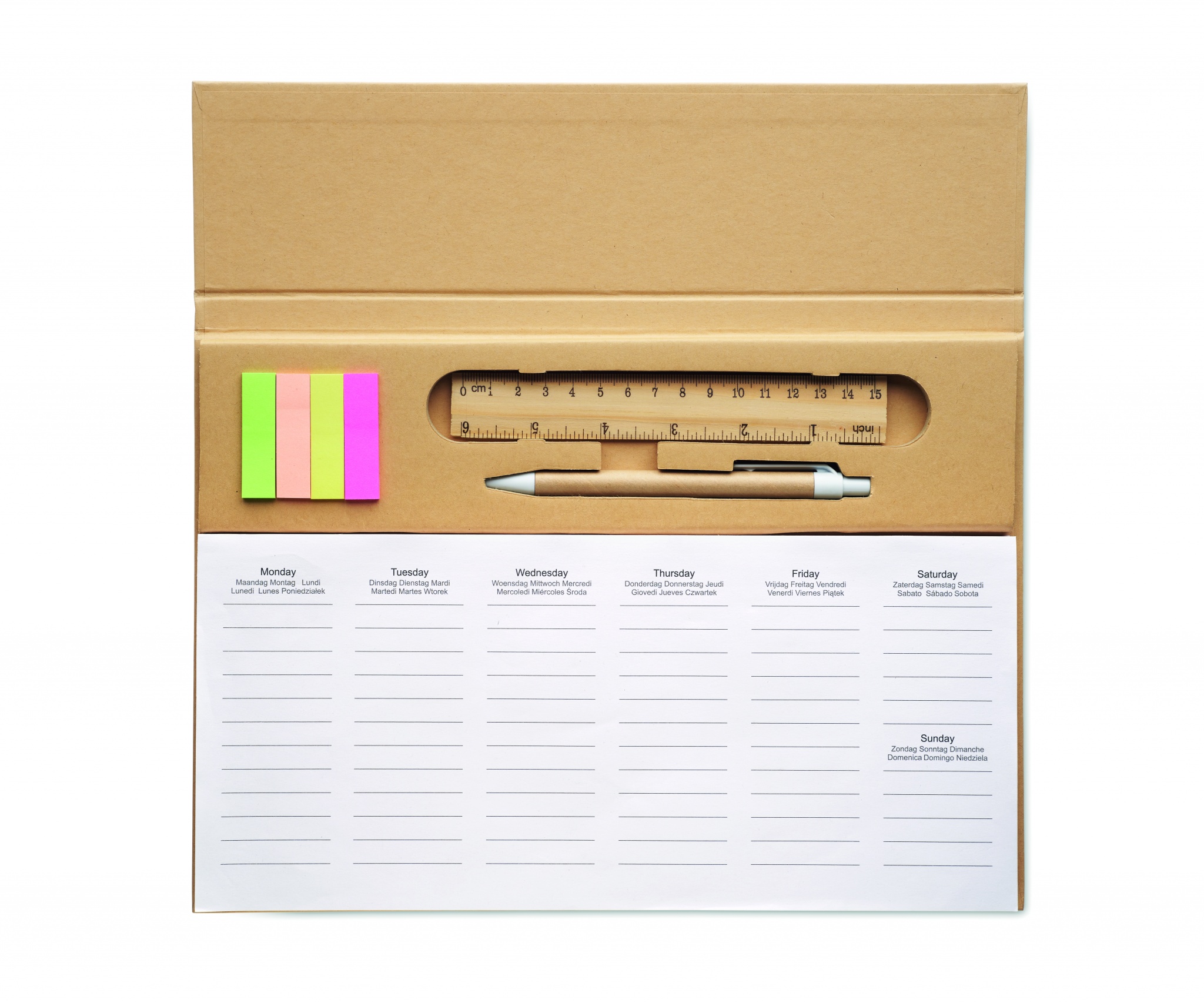 Настольный еженедельник-планер на 125 страниц на 6 языках (EN/DE/FR/ES/IT/NL/PL) с обложкой из крафт-бумаги, картонной ручкой с синими чернилами, деревянной линейкой и блокнотом со стикерами.