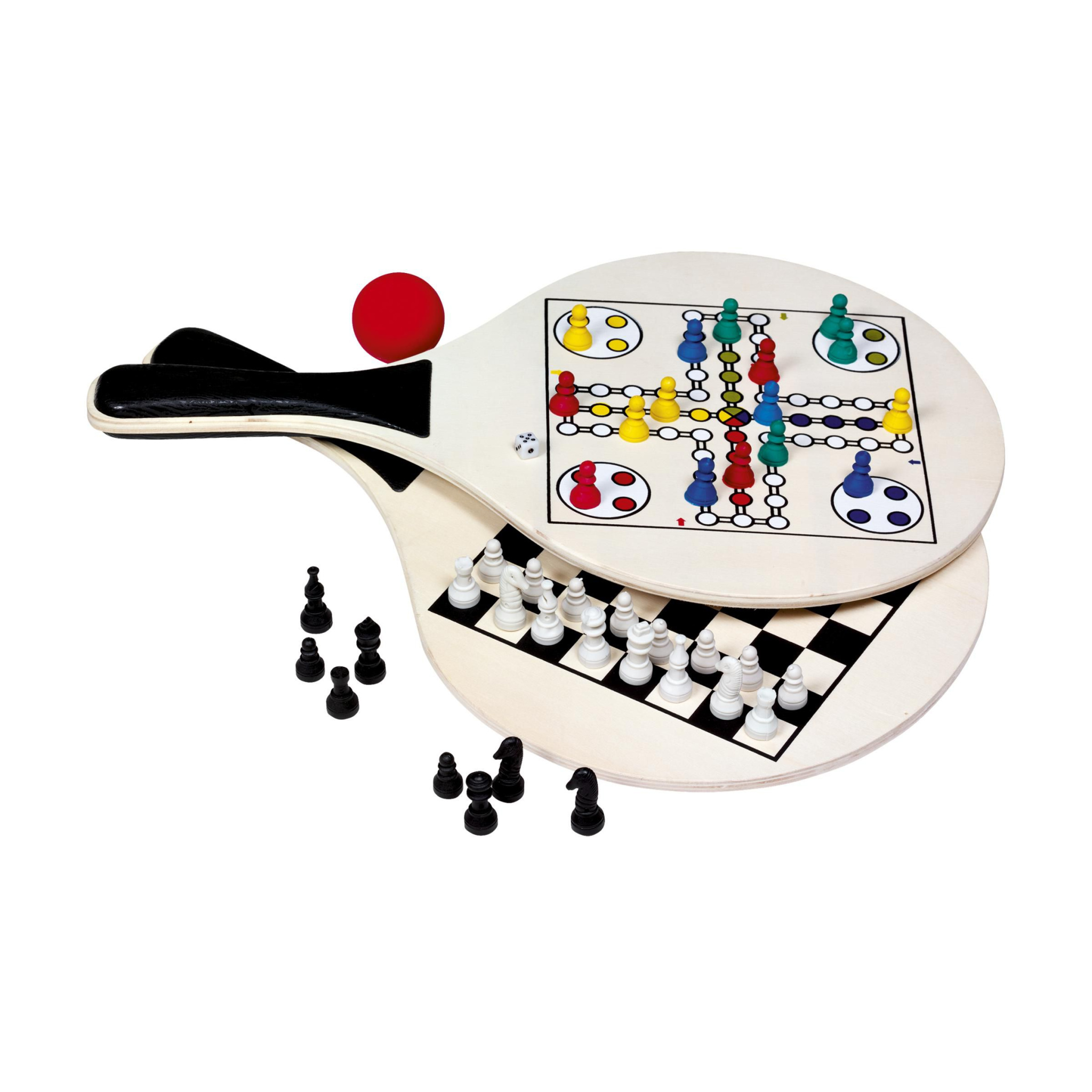 Деревянные ракетки с 2 настольными играми. Включая мяч и игровые фишки. В нейлоновом чехле.