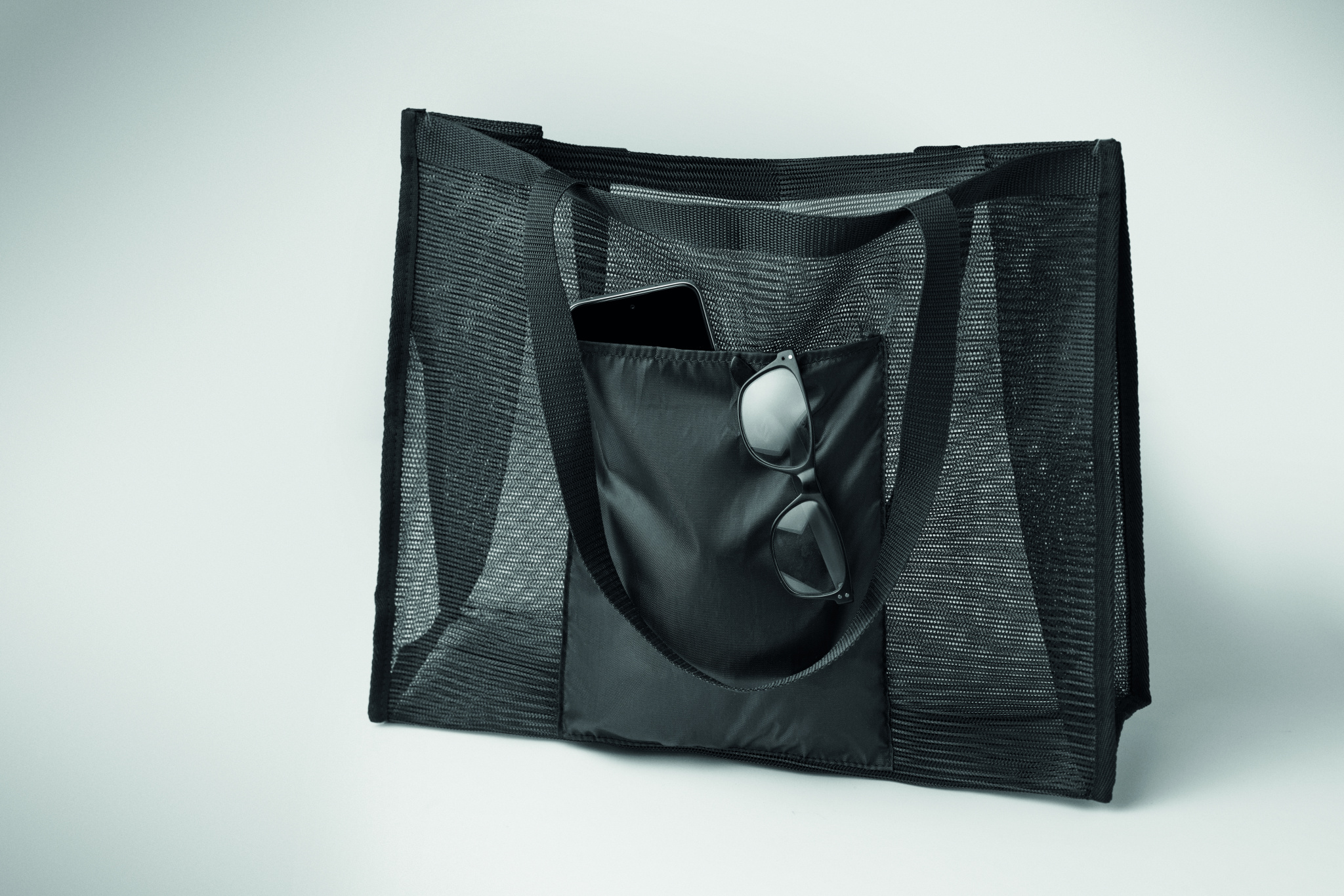 Shopping bag made of RPET mesh and 210D RPET with short handles. Includes large open front pocket. Capacity 20L, load up to 10 kg.