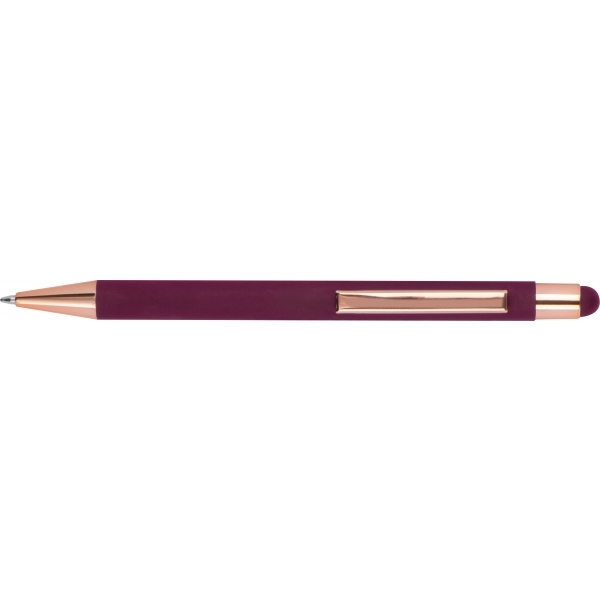 Шариковая ручка из алюминия с резиновым покрытием, акцентами из розового золота и сенсорным пером. Оснащена синим пластиковым стержнем большой емкости. Цвет гравировки: серебристый