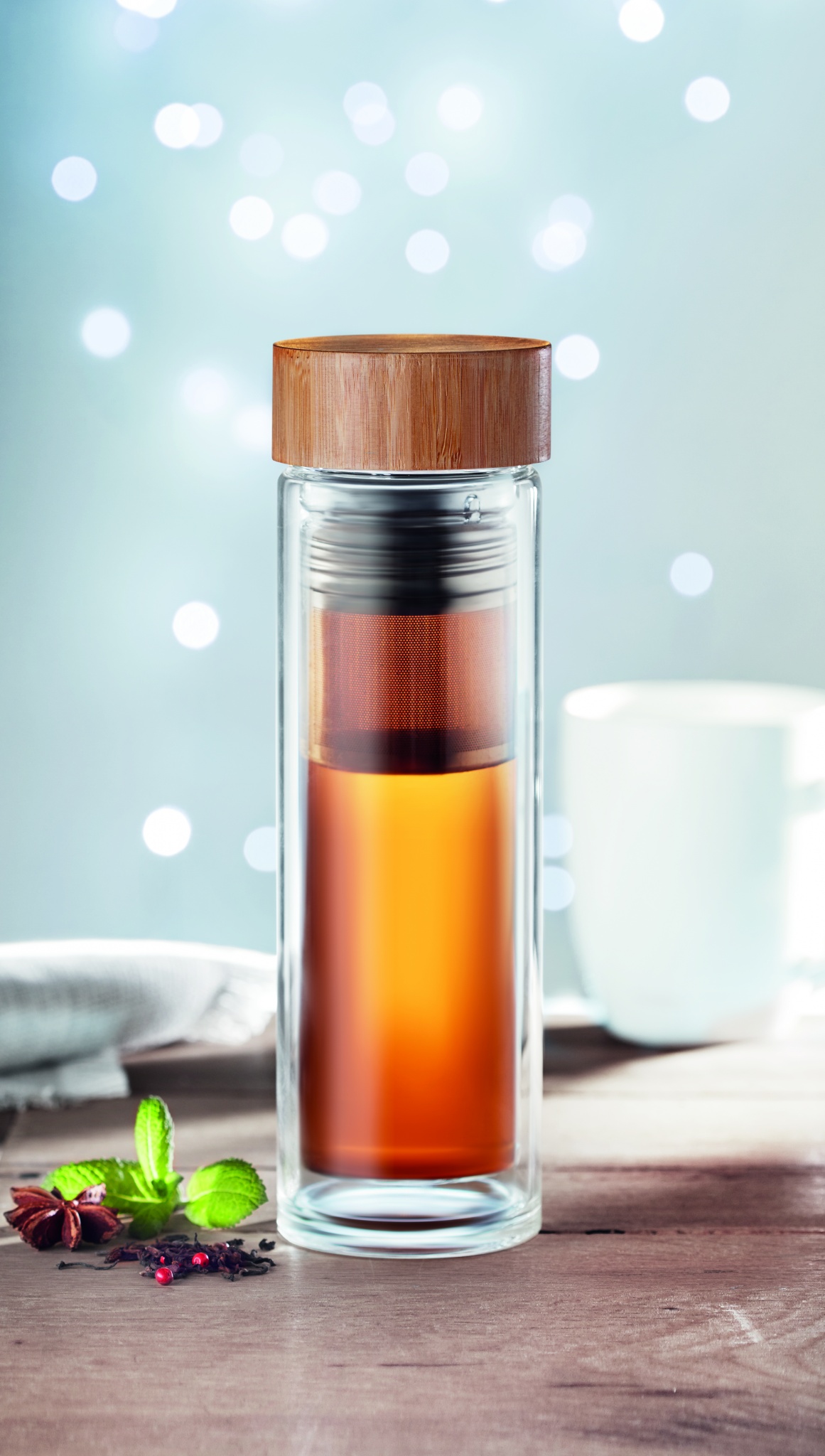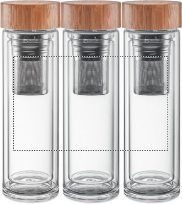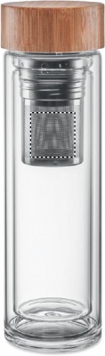 Бутылка из термостойкого стекла с бамбуковой крышкой с чайной сеточкой. Объем 400 мл. Не протекает.