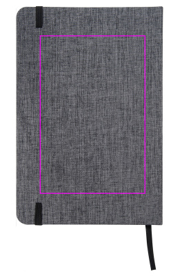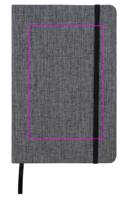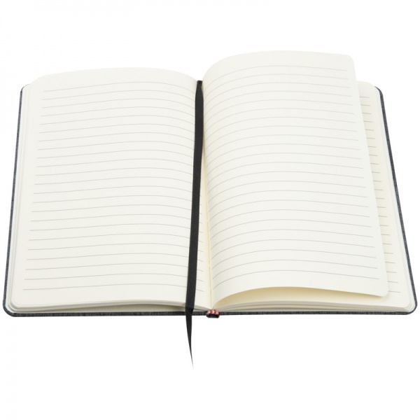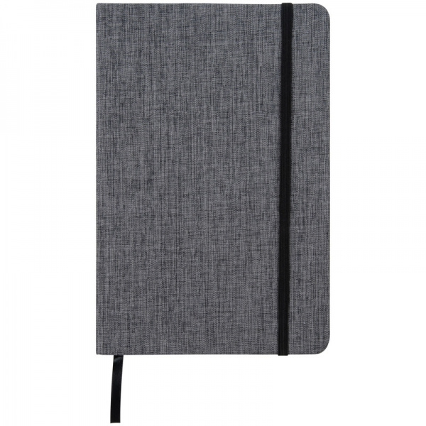 Блокнот формата А5 с стильной обложкой из полиэстера 300D, черной резиновой застежкой и закладкой. 160 линованных страниц. Мы напечатаем ваш логотип на обложке.