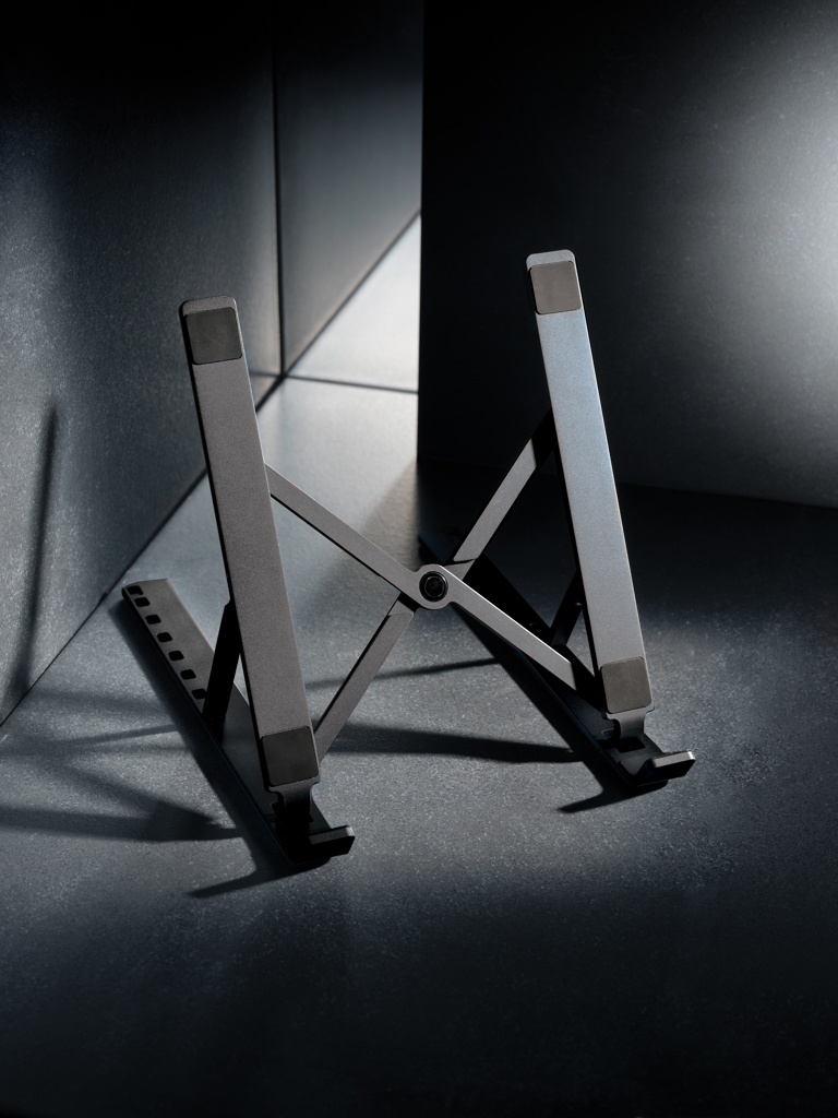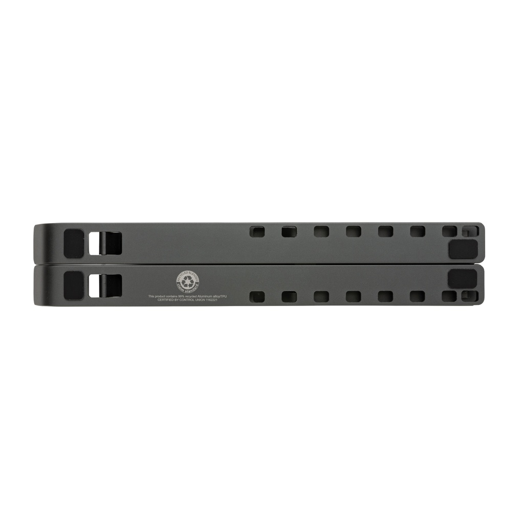 Подставка для ноутбука из алюминия, изготовленная из сертифицированного RCS (Recycled Claim Standard) переработанного алюминия и ТПУ. Общее содержание переработанных материалов: 99% от общего веса изделия. Сертификация RCS гарантирует полностью сертифицированную цепочку поставок переработанных материалов. Подставка складная и может вместить любой ноутбук размером до 15,6 дюймов. Подставку можно отрегулировать под 8 различными углами для оптимальной эргономичной позы при работе с ноутбуком. Алюминий не теряет своих характеристик в процессе переработки и может перерабатываться бесконечно. Совместима с большинством распространенных планшетов и ноутбуков. С сертифицированными RCS полосками переработанного ТПУ внизу для предотвращения скольжения. Упаковано в упаковку FSC® mix.