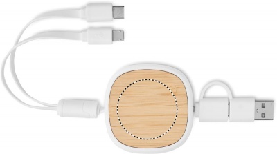 Выдвижной кабель для зарядки из пластика с несколькими USB-разъемами и бамбуковыми деталями в верхней части. Вход: 2-в-1 Type-C и Type-A. Выход: Type-C и 2-в-1 Type-B. Длина кабеля: 90 см.