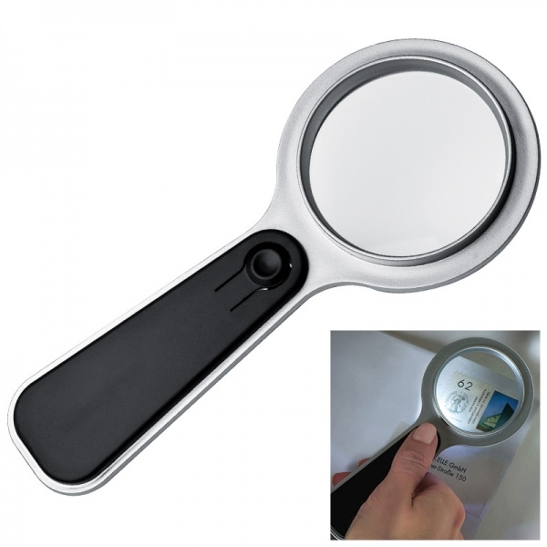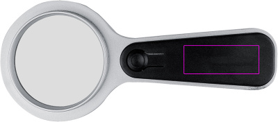 Лупа из пластика с тройным увеличением и встроенным светодиодом. Наносим ваш логотип на ручку. В комплект поставки уже входит кнопочный элемент питания.