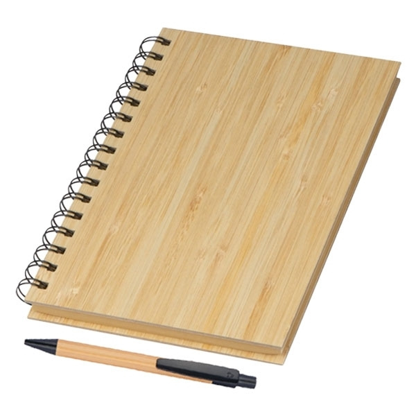 Chic eco-set bestående av en anteckningsbok i DIN A5 med bambuomslag, spiralbindning och 160 raderade sidor av återvunnet papper samt en kulspetspenna i bambu med blå plastpåfyllning och plastapplikationer. Vi kommer att gravera din logotyp på utsidan av anteckningsbokens omslag.