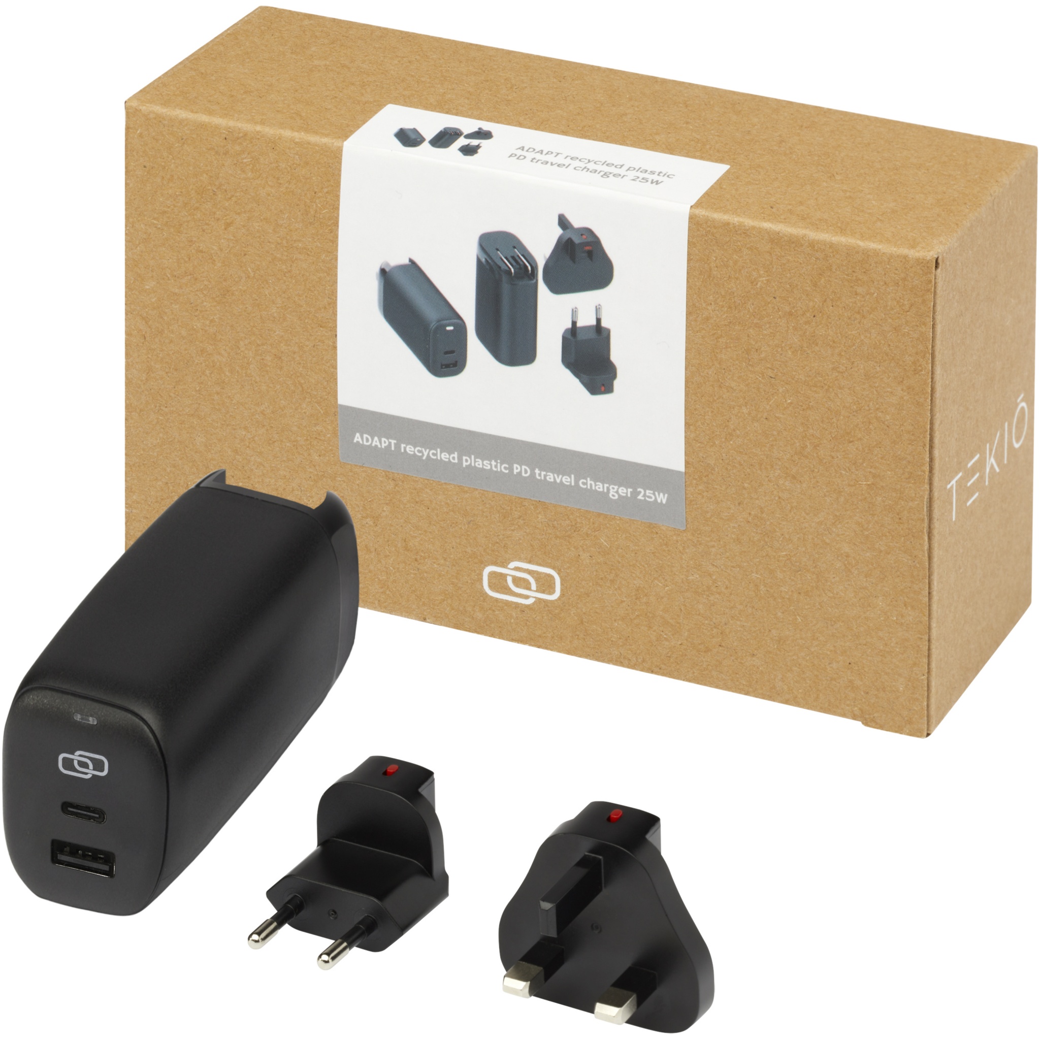 PD-reseladdaren ADAPT i återvunnen plast är en kompakt och miljövänlig laddningslösning som är utformad för att hålla dig uppladdad med stil medan du är på språng. Med sitt hölje av återvunnen plast och koppar- och nickelpläterade komponenter erbjuder denna laddare både hållbarhet och långsiktighet. Laddaren levereras med pluggar som är kompatibla med eluttag i USA, EU och Storbritannien, så att du enkelt kan använda den i olika regioner. Den inbyggda transformatorn säkerställer smidig strömkonvertering för internationella resor (AC 100–240 V, 50/60 Hz). Denna reseladdare levereras med två portar (Type-C och USB A) som erbjuder mångsidiga och supersnabba laddningsalternativ, och PPS-funktionen (Programmerbar strömförsörjning) möjliggör adaptiv laddning. Levereras i en förstklassig kraftpapperslåda med ett färgstarkt klistermärke.