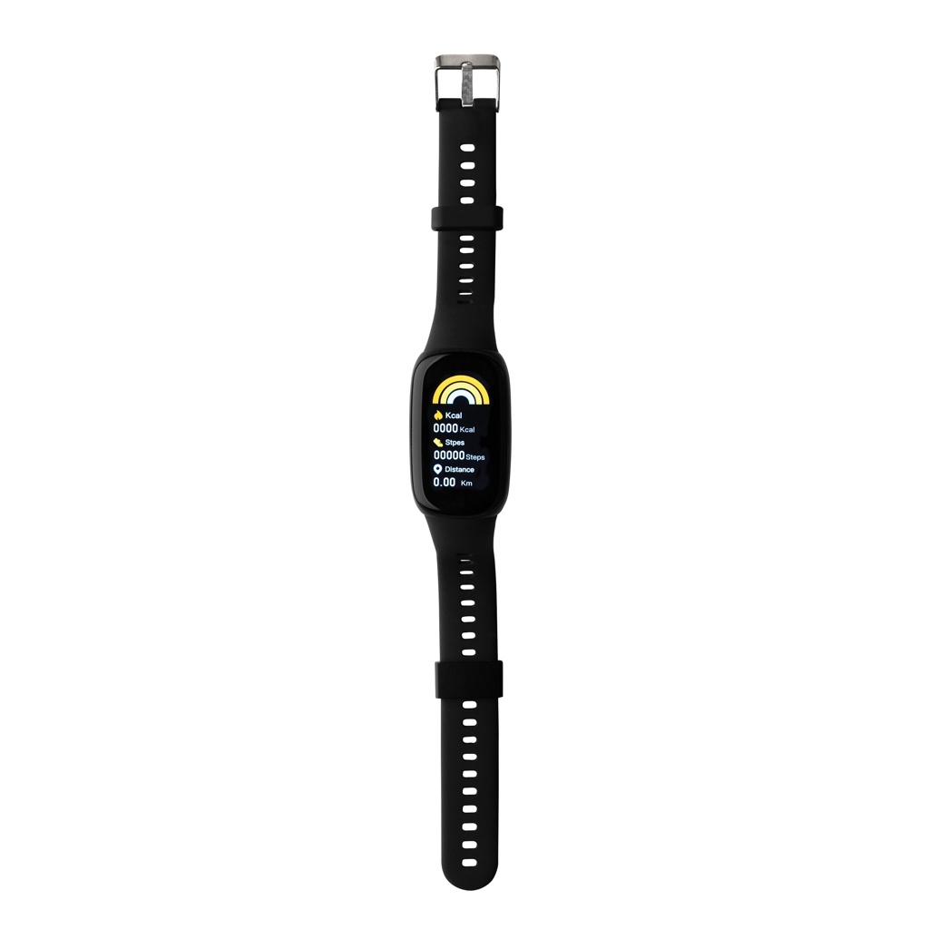 Vattentätt (IP67) aktivitetsarmband med bekvämt armband i återvunnen TPU så att det kan bäras både på dagen och natten. Lättnavigerad 1,47” stor touch OLED färgskärm. Tillverkad av RCS (Recycled Claim Standard) certifierad återvunnen TPU (armbandet) och ABS (ramen). Totalt återvunnet innehåll: 28% baserat på total produktvikt. RCS certifiering säkerställer en helt certifierad leveranskedja av de återvunna materialen. Med gratis app. BT 5.0. Funktioner: påminnelse meddelanden, intelligent alarm, klocka, stegräknare, distans, kaloriräknare, pulsmätare, blodtrycksmätare, mäter syresättning av blodet, Multi-sport läge (11), gå, springa, rida, sit-up etc.), musikkontroll, meddelanden, sömnläge, inkommande samtal, stoppur. Standby-tid 20 dagar och en arbetstid på upp till 10 dagar. Levereras i FSC® mix kraft förpackning. Produkt och accessoarer är 100% PVC-fria.