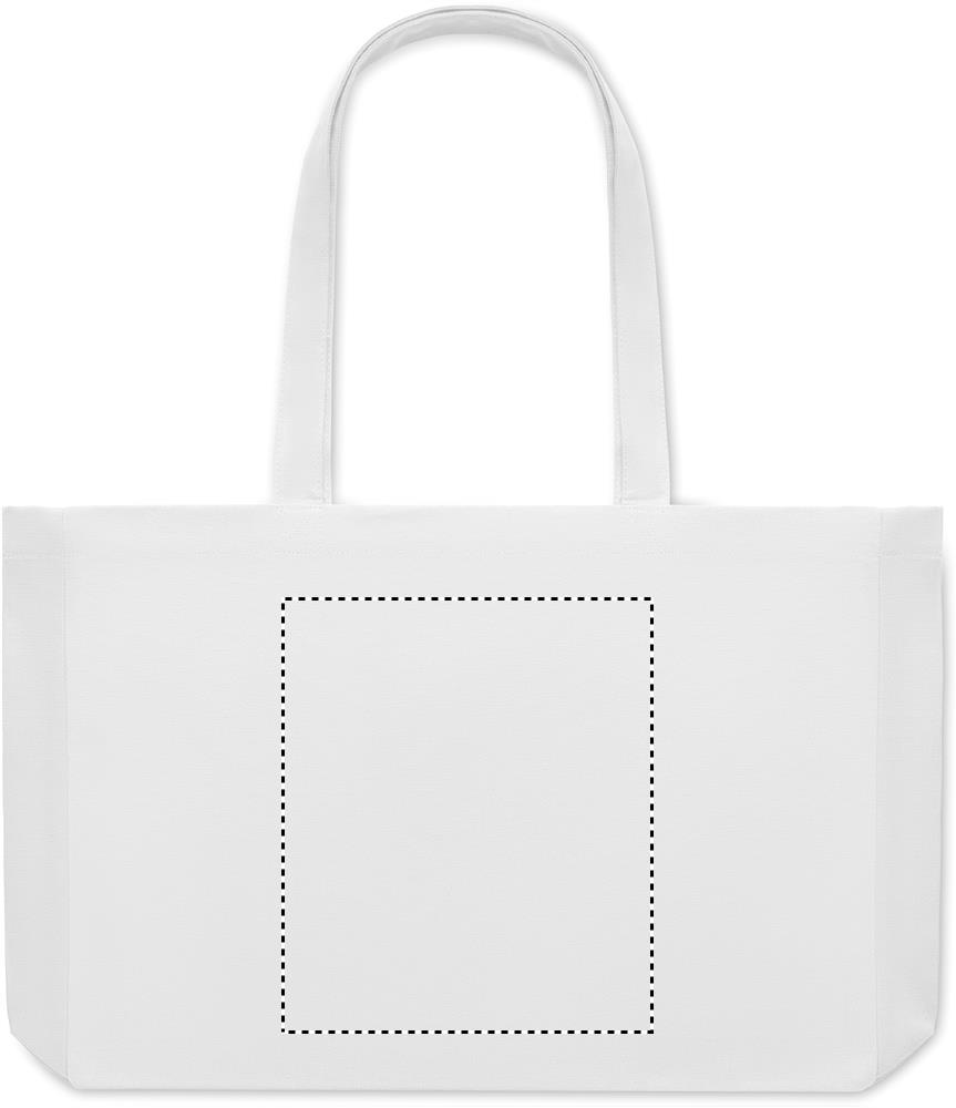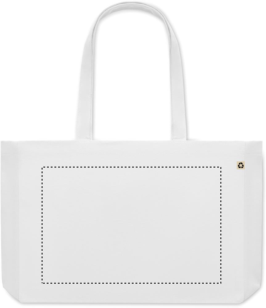 Tygkasse eller strandväska i färgad canvas gjord av 50% bomull och 50% återvunnen bomull. Långa handtag och bälg. Kvalite: 280gr/m².