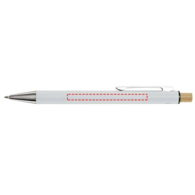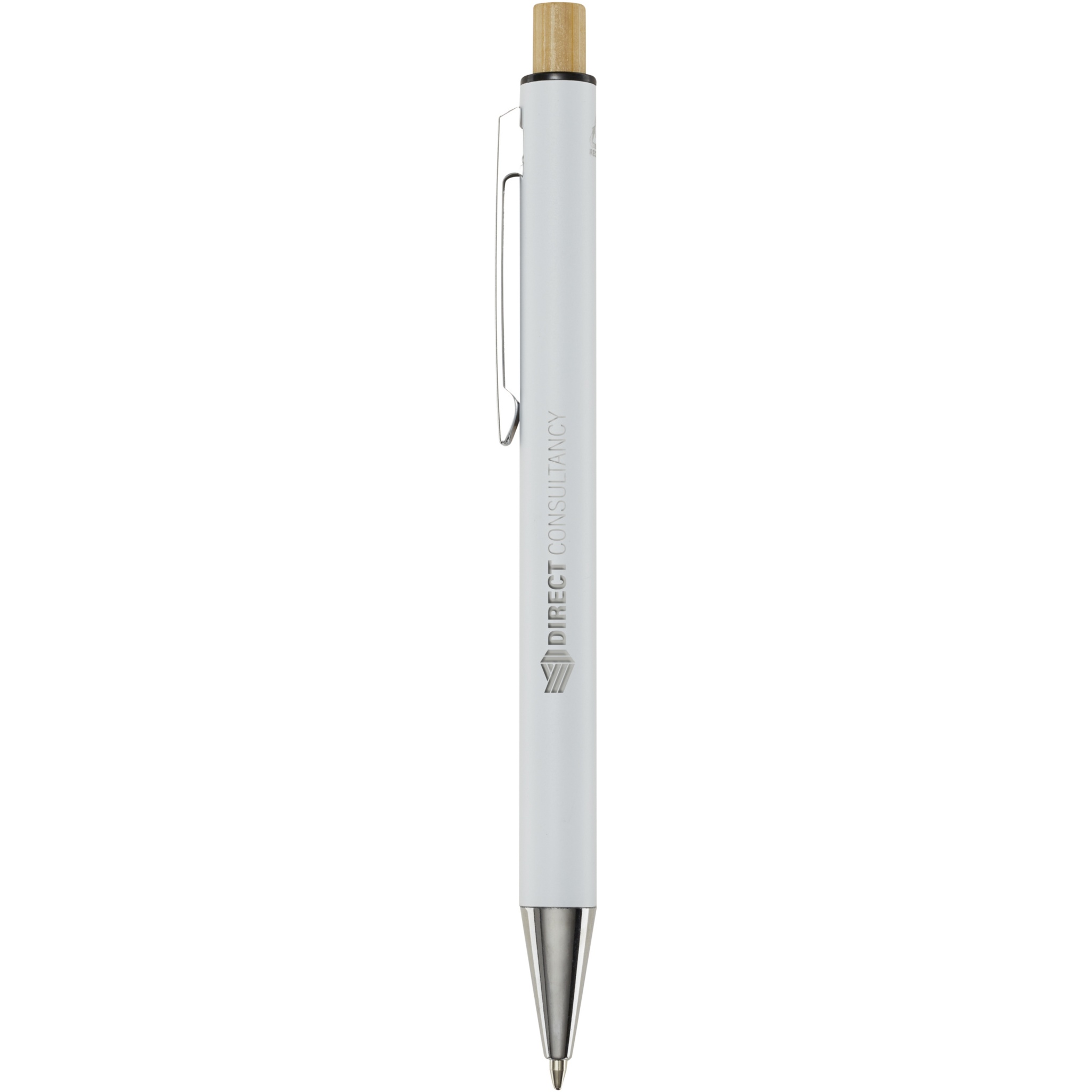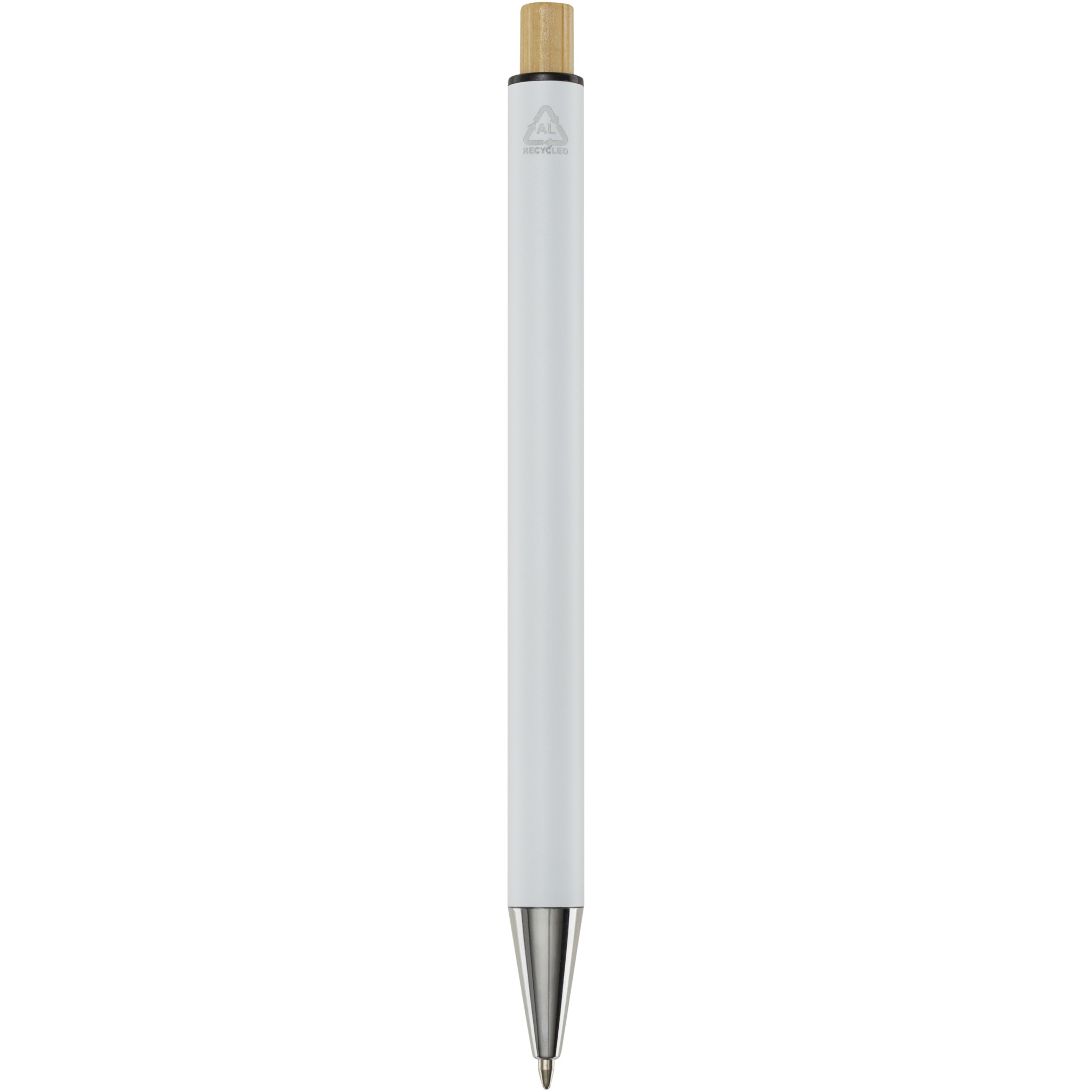 Kulspetspennan Cyrus är tillverkad av återvunnen aluminium, vilket kräver mindre energi än att tillverka aluminium från råmaterial. Den minskar också mängden avfall och bidrar till att bevara naturresurser med syftet att minska växthusgasutsläppen. Tryckknappen är tillverkad av bambu. Bläckfärg: Blå. Skrivlängd: 800 meter. Spetsstorlek: 1,00 mm.