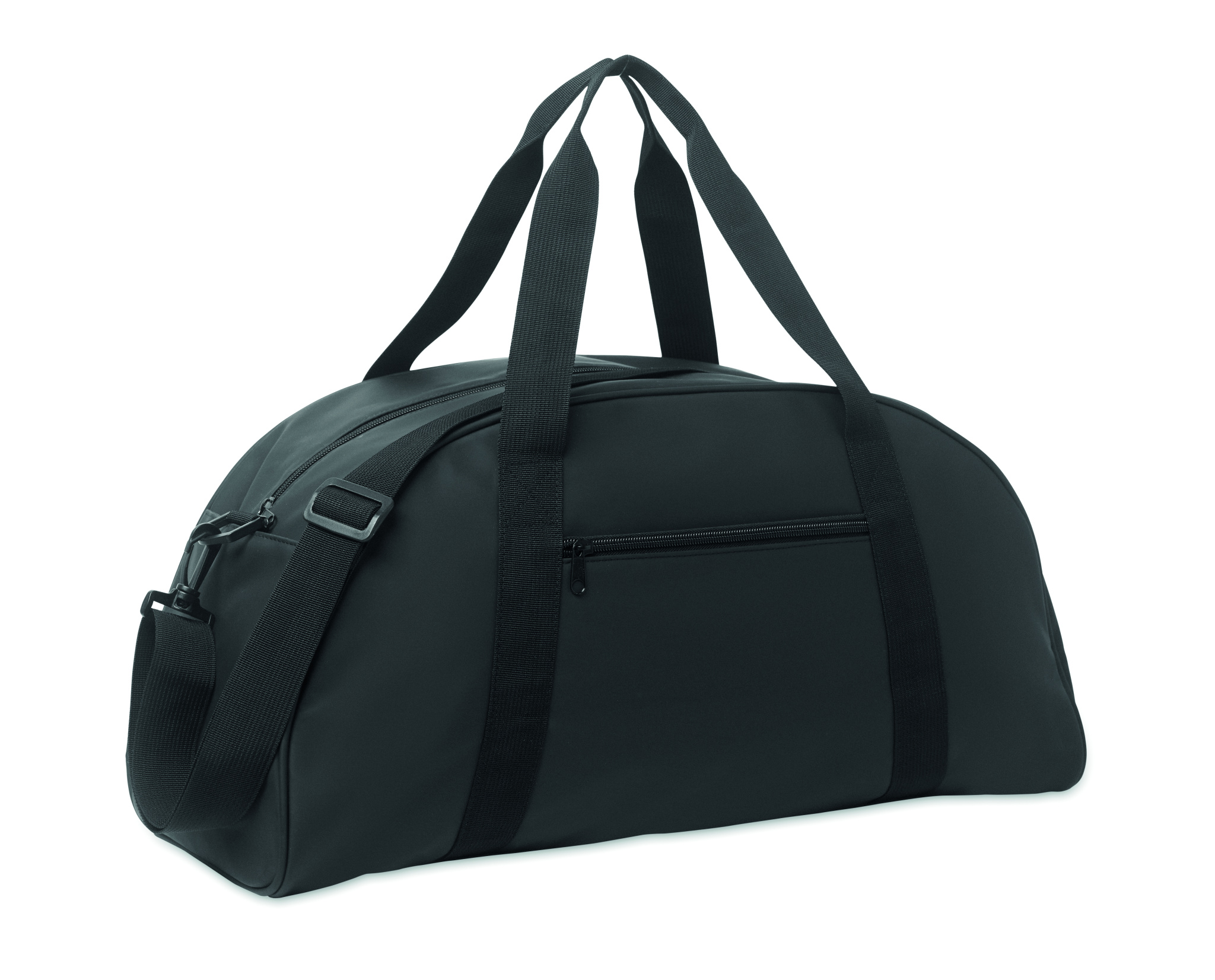 Dufflebag/väska i mjuk PU med skumförstärkning i botten. Ett huvudfack, frontficka med dragkedja och innerficka med dragkedja. foder i 210D RPET polyester. 2 handtag och en justerbar och avtagbar axelrem