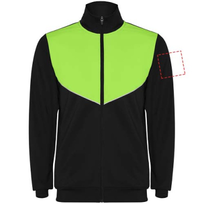 Träningsoverall i lätt och elastiskt tyg. Jacka med kontrasterande färg och sömnadskant på bröstet. Hög krage med kontrasterande sömmar. Centralt blixtlås fram. Sidofickor. 2 x 2 ribbade muddar och midja. Byxor med elastisk linning och dragsko. Kontrasterande sidostycke med sömnadskant. Dragkedja i fåll.