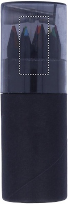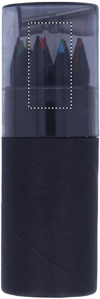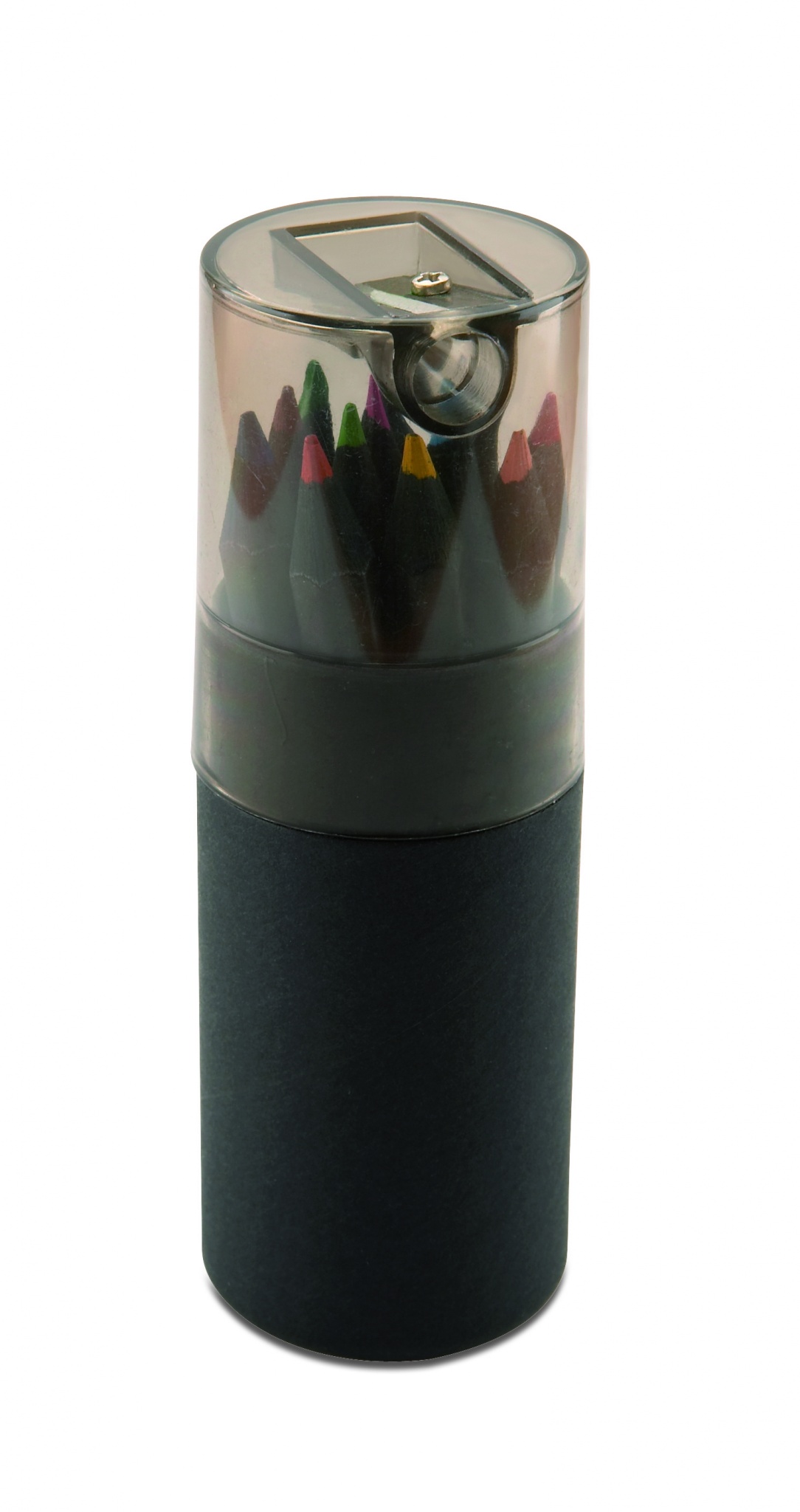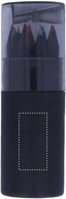 Svart Pennset med 12 färgade blyertspennor med en pennvässare i locket på asken.