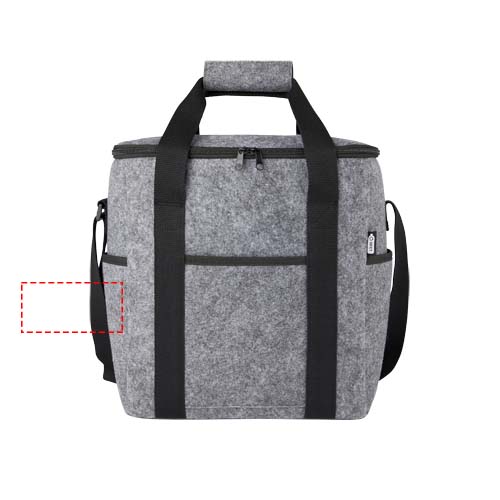 Stor kylväska tillverkad av högkvalitativ, mjuk och hållbar GRS-certifierad återvunnen filt. Har ett stort huvudfack (för sex 1,5-litersflaskor) fodrat med livsmedelssäker och extra tjock PEVA-isolering med hög densitet som håller drycker och förfriskningar kalla i timmar. Övre blixtlåsstängning, ficka framtill och två sidfickor för extra förvaring. Justerbara långa vävda axelband i bomull (55 x 3,8 cm) och två vävda bärhandtag i bomull (25 x 3,8 cm) med kardborreknäppning upptill. Lätt att rengöra. Kapacitet: 21 liter.