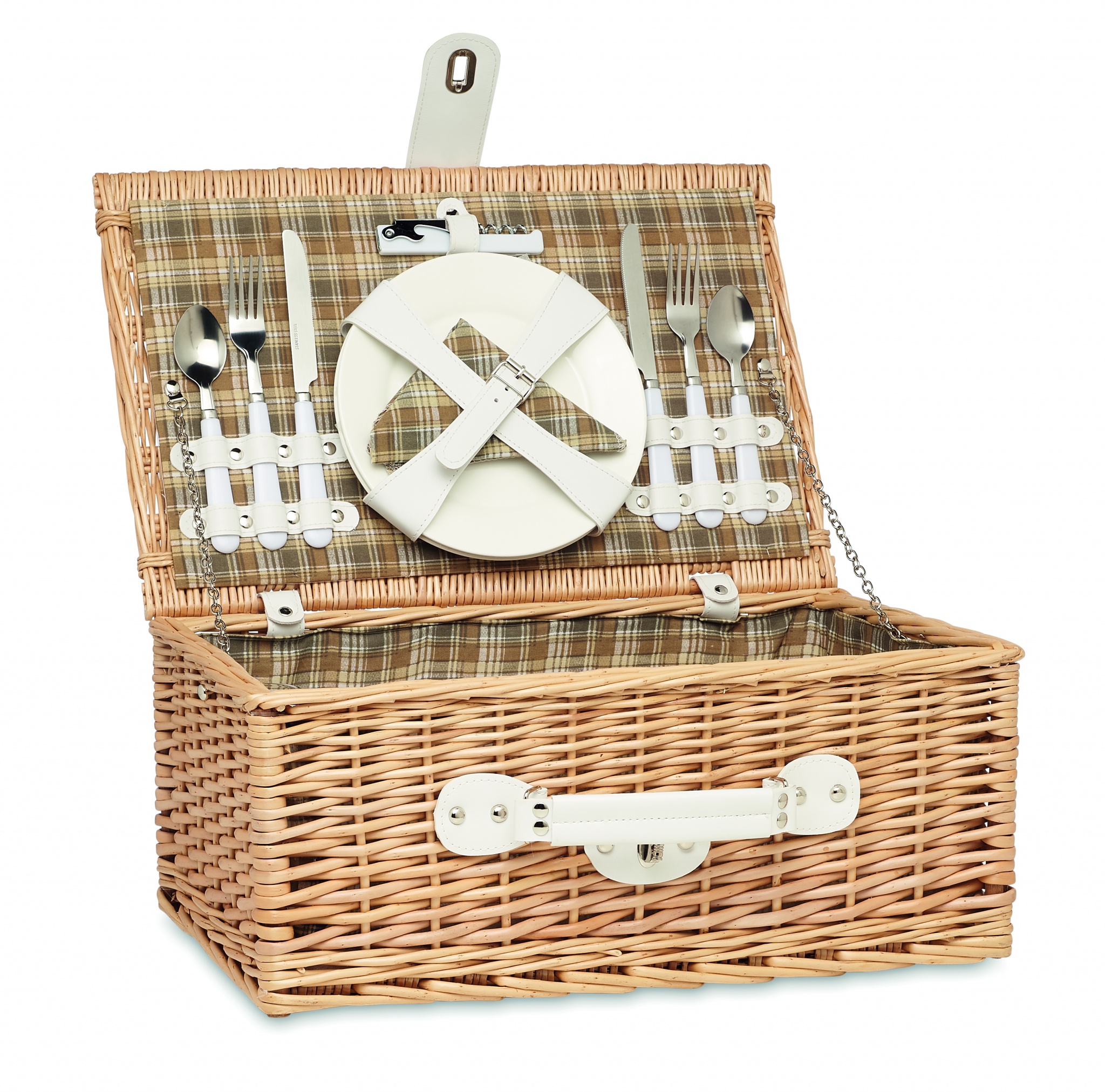 Klassisk flätad picknick korg för 2 personer innehållande 1 flasköppnare, 2st rostfria skedar, gafflar och knivar. 2st porslinstallrikar, 2st glas och 2st servetter.