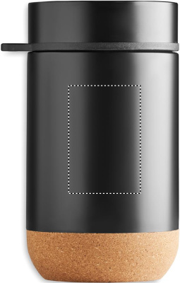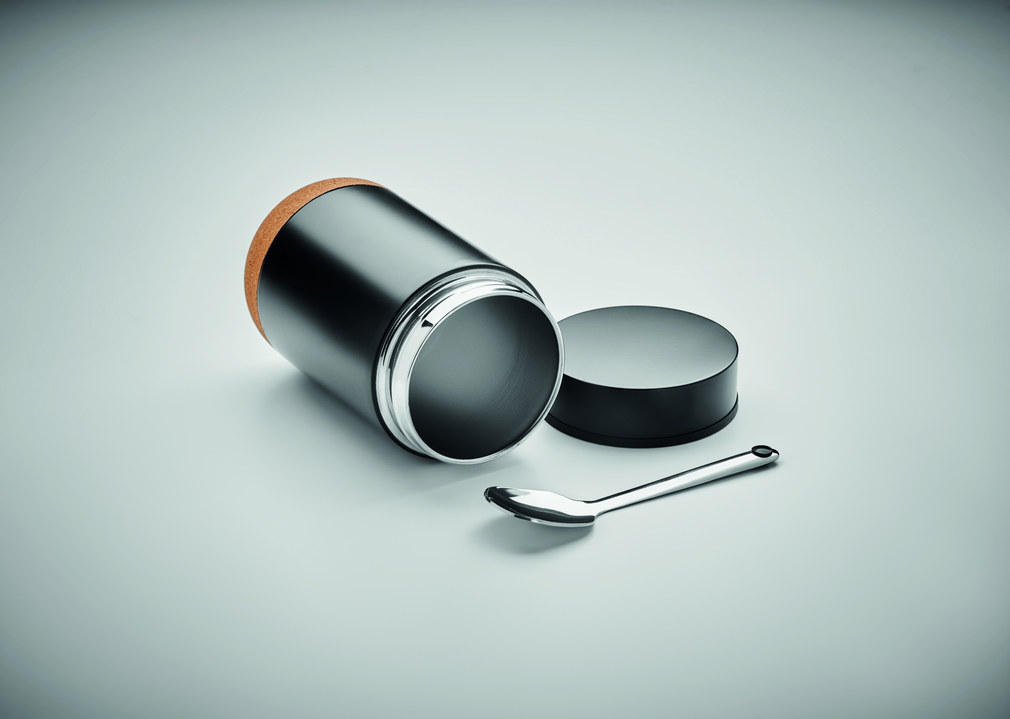 Dubbelväggig isolerad förvaringsburk i rostfritt stål med skruvlock och korkbottendetalj. Inklusive sked. Kapacitet: 400 ml.