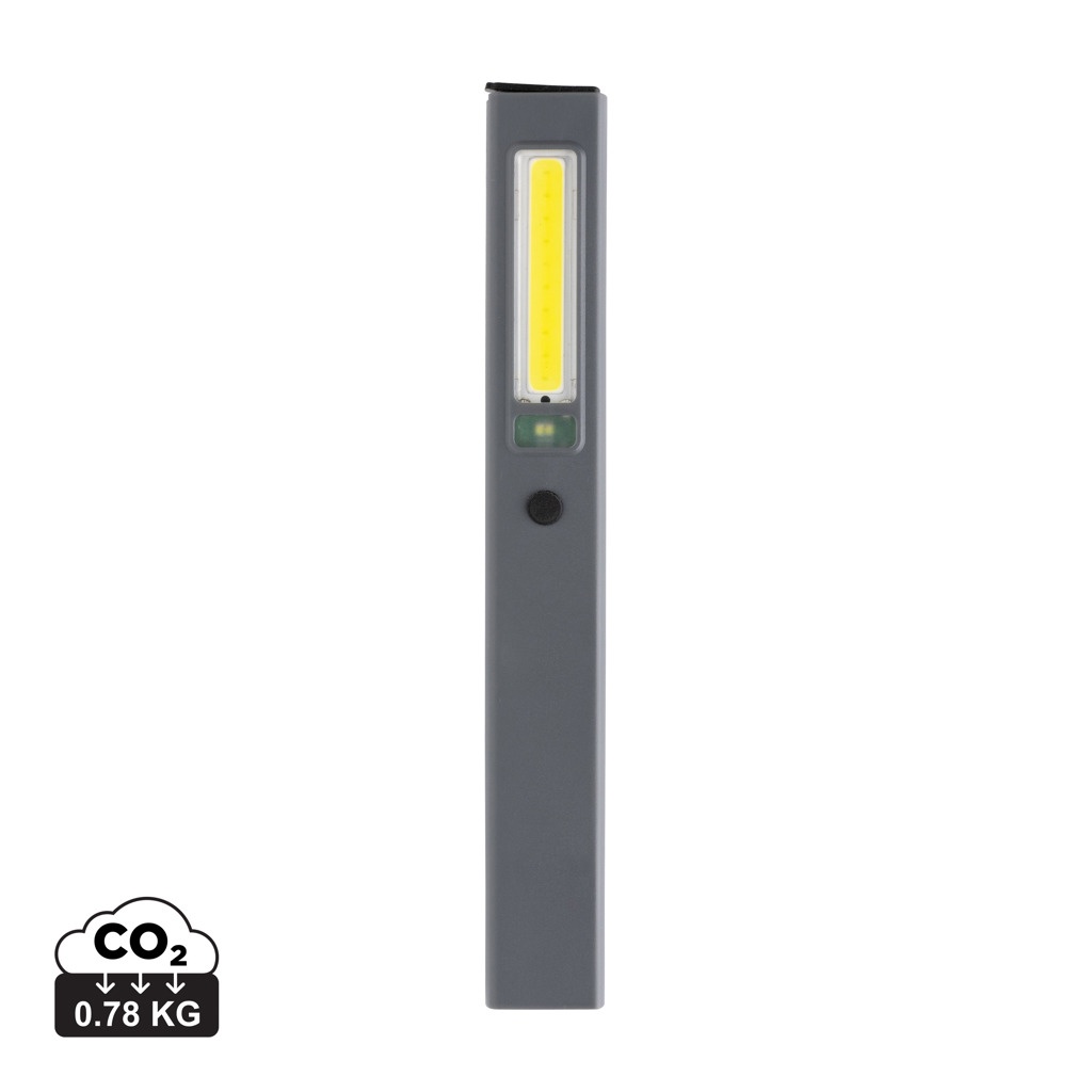 Inspektionslampa i fickformat tillverkad av RCS-certifierad återvunnen ABS-plast. Totalt återvunnet innehåll: 33% baserat på total produktvikt. RCS-certifieringen säkerställer en helt certifierad leveranskedja för det återvunna materialet. Arbetslampan använder ett uppladdningsbart A-klass 520 mah litiumbatteri så du behöver inte byta batterier. Ladda via ditt USB-uttag. Arbetslampan levereras med 220 lumen COB-lampa och 80 lumen LED-lampa. Med 3 lägen: LED, COB och COB röd. Med klämma för att fästa i bälte eller ficka och magnet. Med type C-port för laddning. Drifttid på en laddning: 3 timmar.