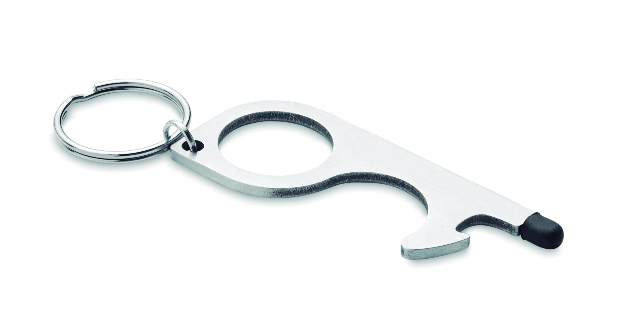 Hygieniskt multiverktyg 5-i-1 nyckelring, rostfritt stål. Minska beröring av te.x. öppna dörrar, tryck på hissar, trafikljus, automater och mobila enheter. Inklusive en flasköppnare, penna och nyckelring. Det enkla sättet att förhindra spridning av bakterier.