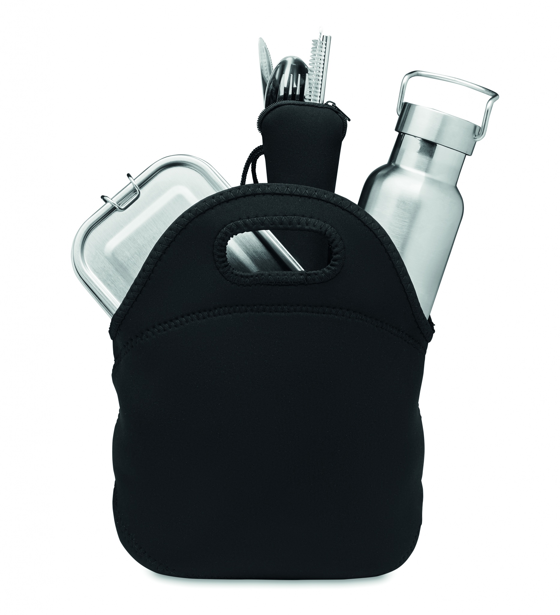 Set inklusive vakuumflaska med dubbelvägg i rostfritt stål (500 ml) , lunchlåda (600 ml) och bestick i neoprenväska med dragkedja.