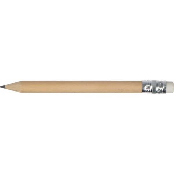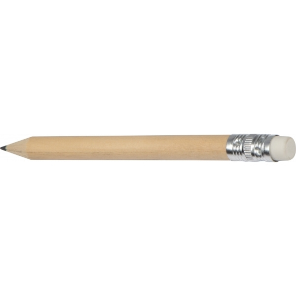 Minipenna av trä med suddgummi. Pennan kommer förvässad.