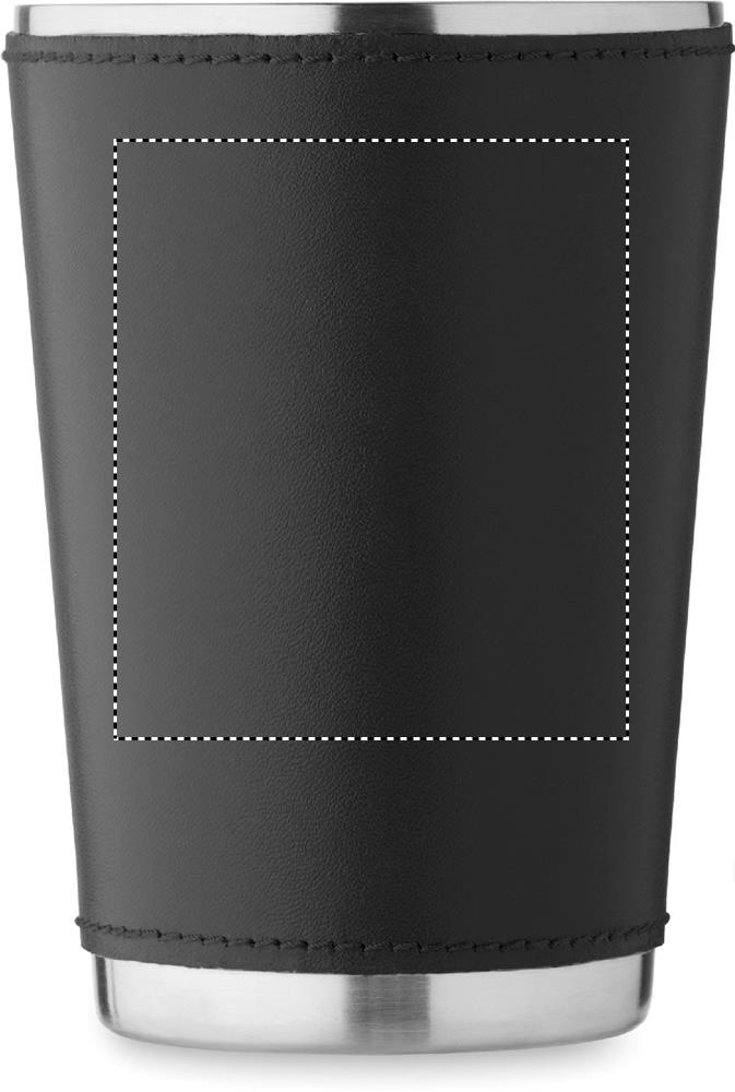 Dubbelväggig mugg i återvunnet rostfritt stål (90% återvunnet rostfritt stål och 10% rostfritt stål) med avtagbart PU-läderhölje. Lock med skjutbart drickhål. Läckagesäker. Volym: 350 ml.
