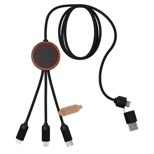 5-i-1 återvunnen PET-laddningskabel med upplyst logotyp och runt bambuhölje. Den upplysta logotypen syns på båda sidorna. Innehåller 3 kontakter (typ C, micro-USB, iPhone) och en dubbel USB-kontakt för universell användning. Levereras i en TPU-påse, med ett kraftpapperskort. Kabellängd: 1 meter. Inkluderar 3 års garanti.