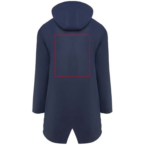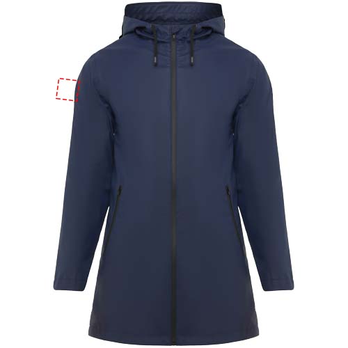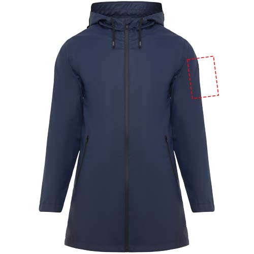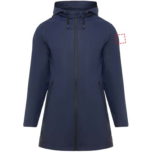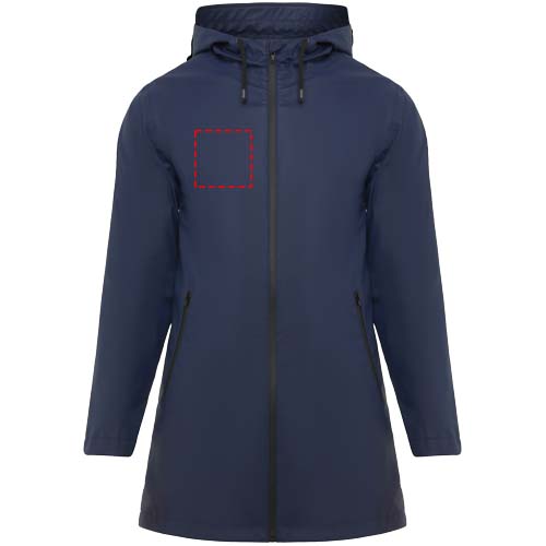 Vattentät regnjacka för dam. Huva med topp. Värmeförseglade dragkedjor och sömmar. Kontrasterande detaljer i svart. Två sidfickor med dragkedja. Slits i bakre fållen. Borttagbar etikett. Vattentät. Modellen är 179 cm och bär storlek S.