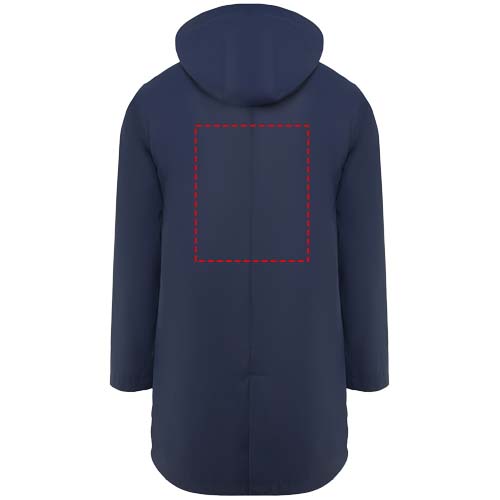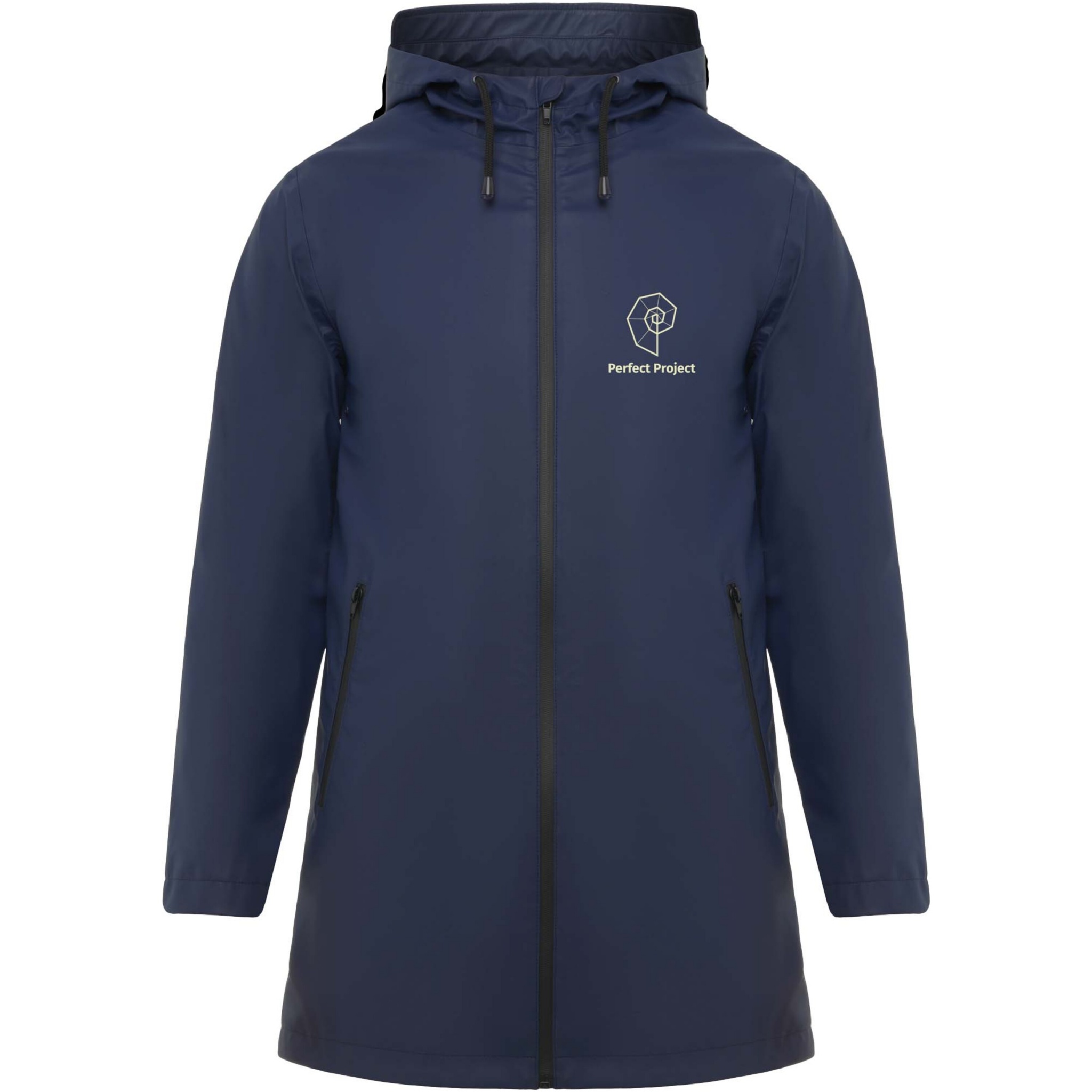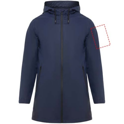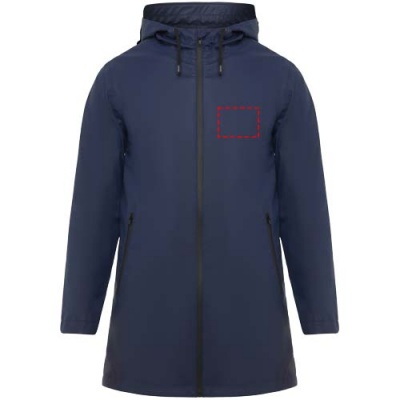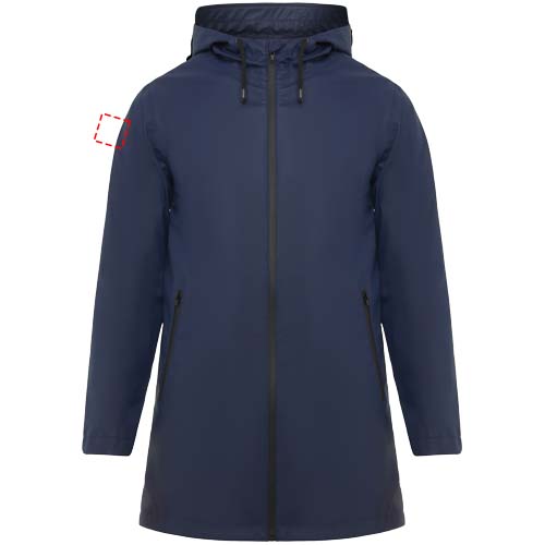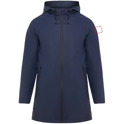 Vattentät regnjacka. Huva med topp. Värmeförseglade dragkedjor och sömmar. Kontrasterande detaljer i svart. Två sidfickor med dragkedja. Slits i bakre fållen. Borttagbar etikett. Vattentät. Modellen är 185 cm och bär storlek M.