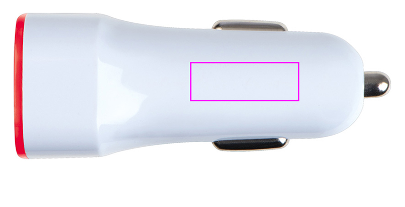 Snygg laddningsadapter för 12V biluttaget med två platser för snabb eller vanlig laddning, färgringen lyser under laddning. Vi trycker din logotyp ovanför ringen.